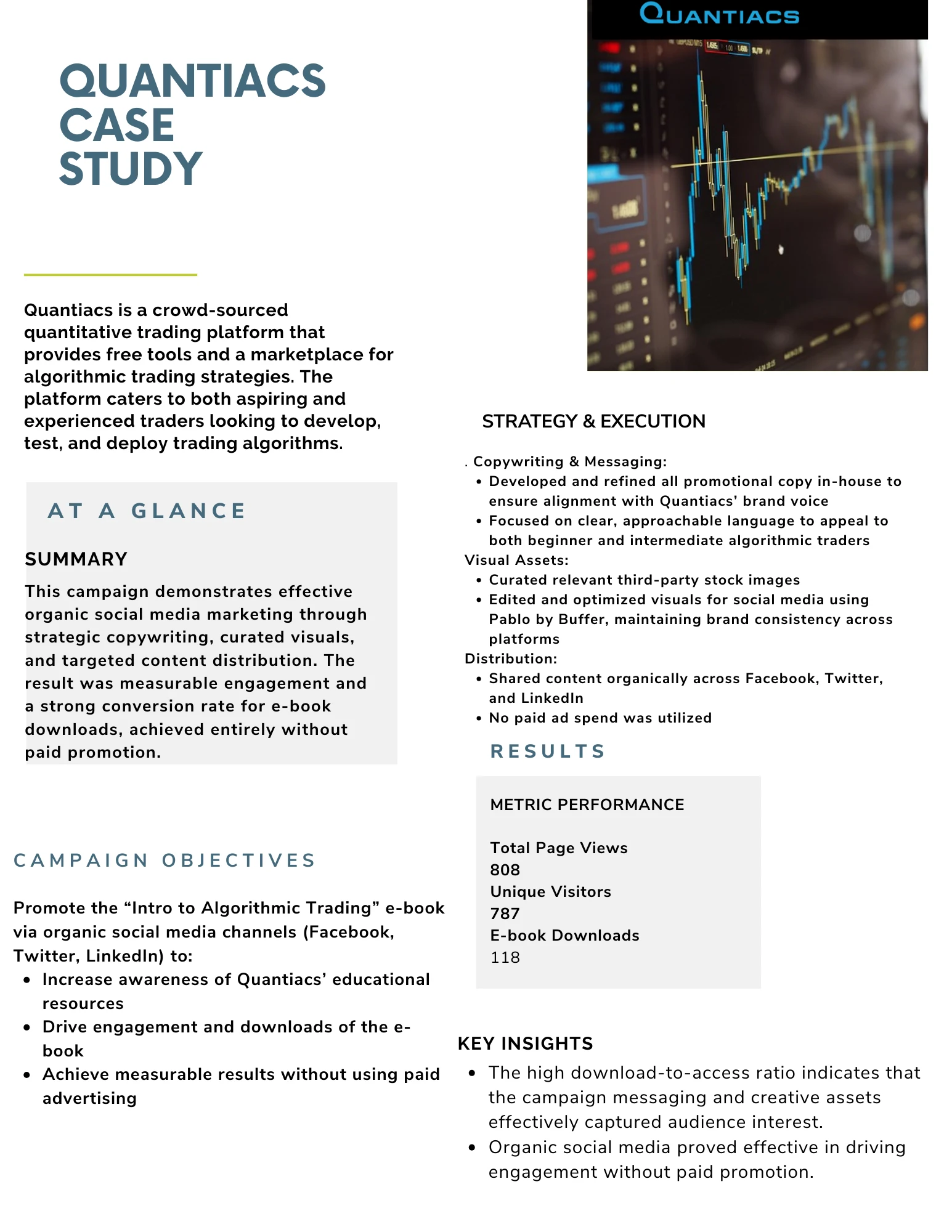 Increased engagement and e-book conversions for Quantiacs with strategic copywriting, curated visuals, and unpaid social distribution.