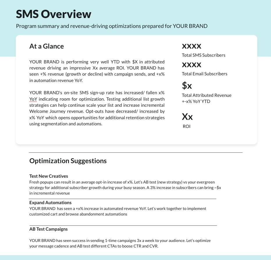 Sample end of year recap of client success metrics for an SMS marketing program. Included a high-level overview of metrics, key wins, and future optimizations.