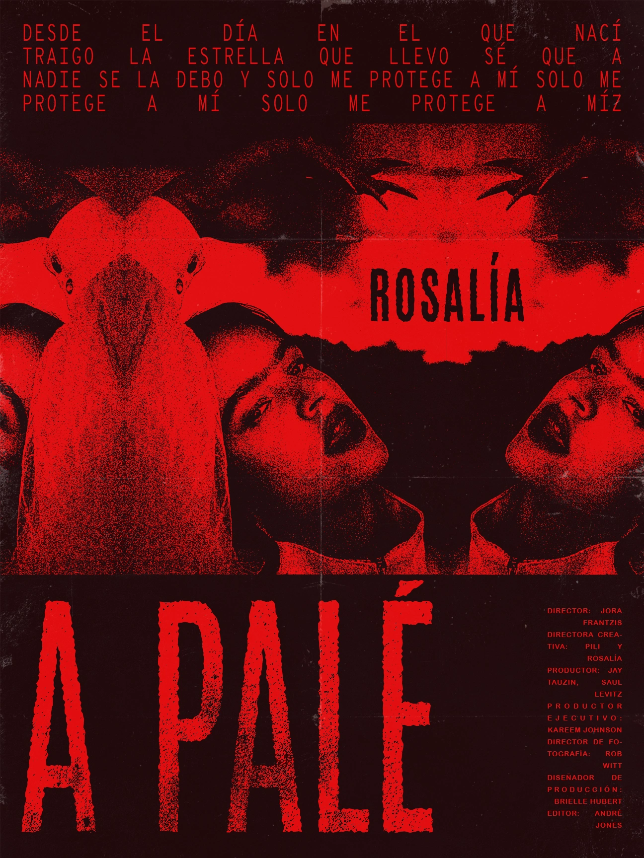 A grunge poster inspired by the music video for Spanish artist Rosalía Villa Tobella's 'A Palé'. The typography and texture are meant to invoke imagery of 60s and 70s horror movie posters using brutalist layouts.