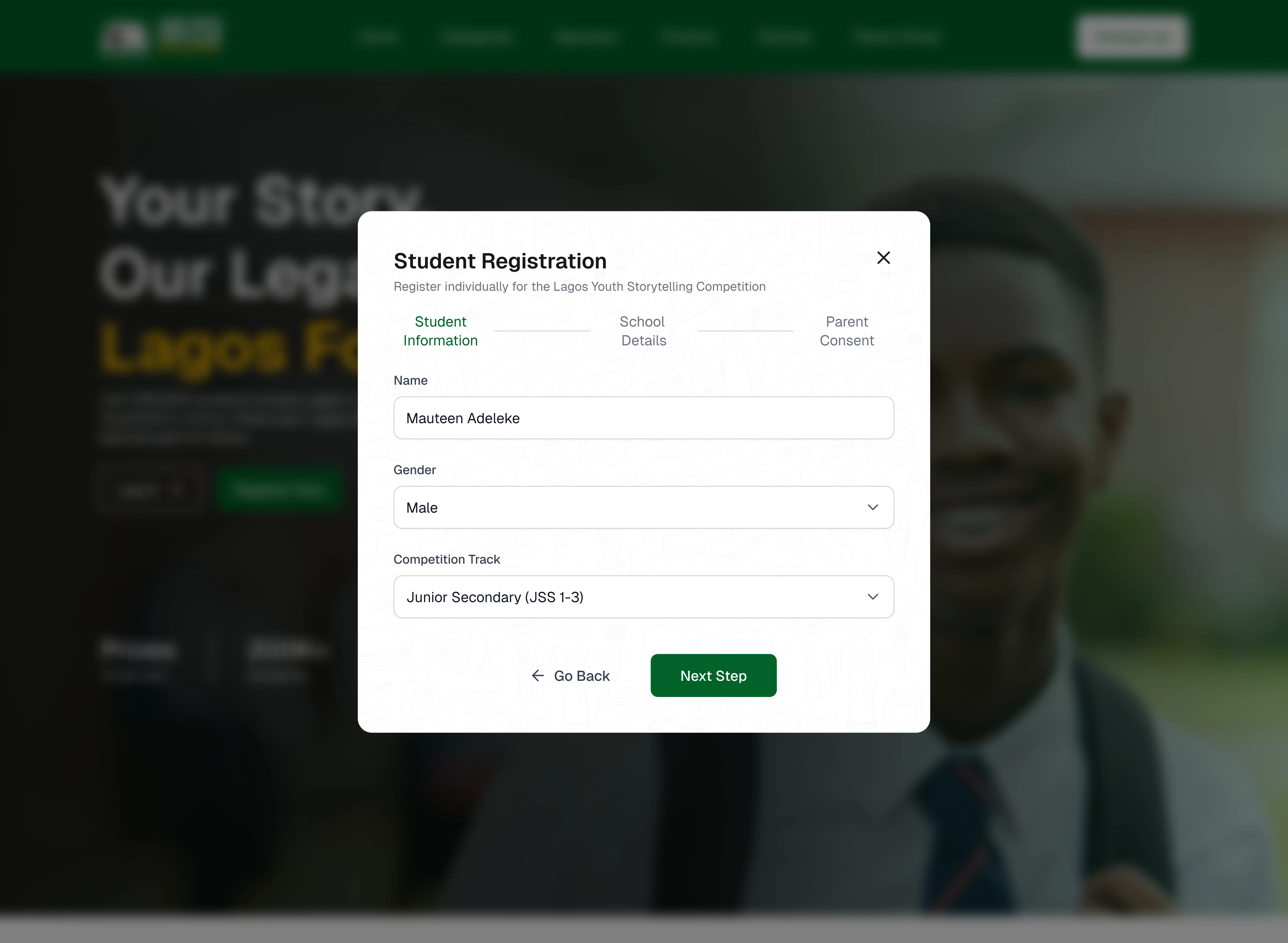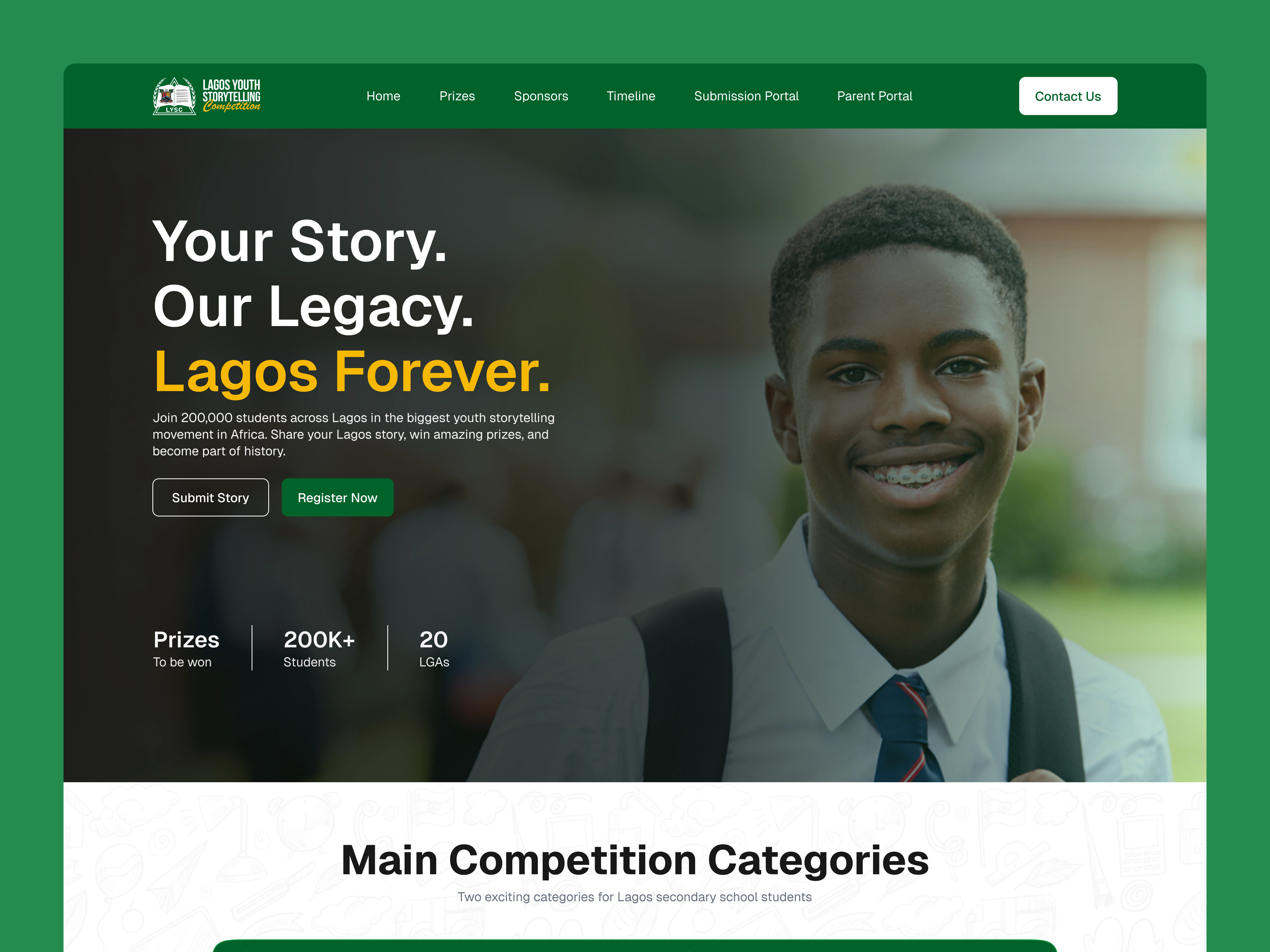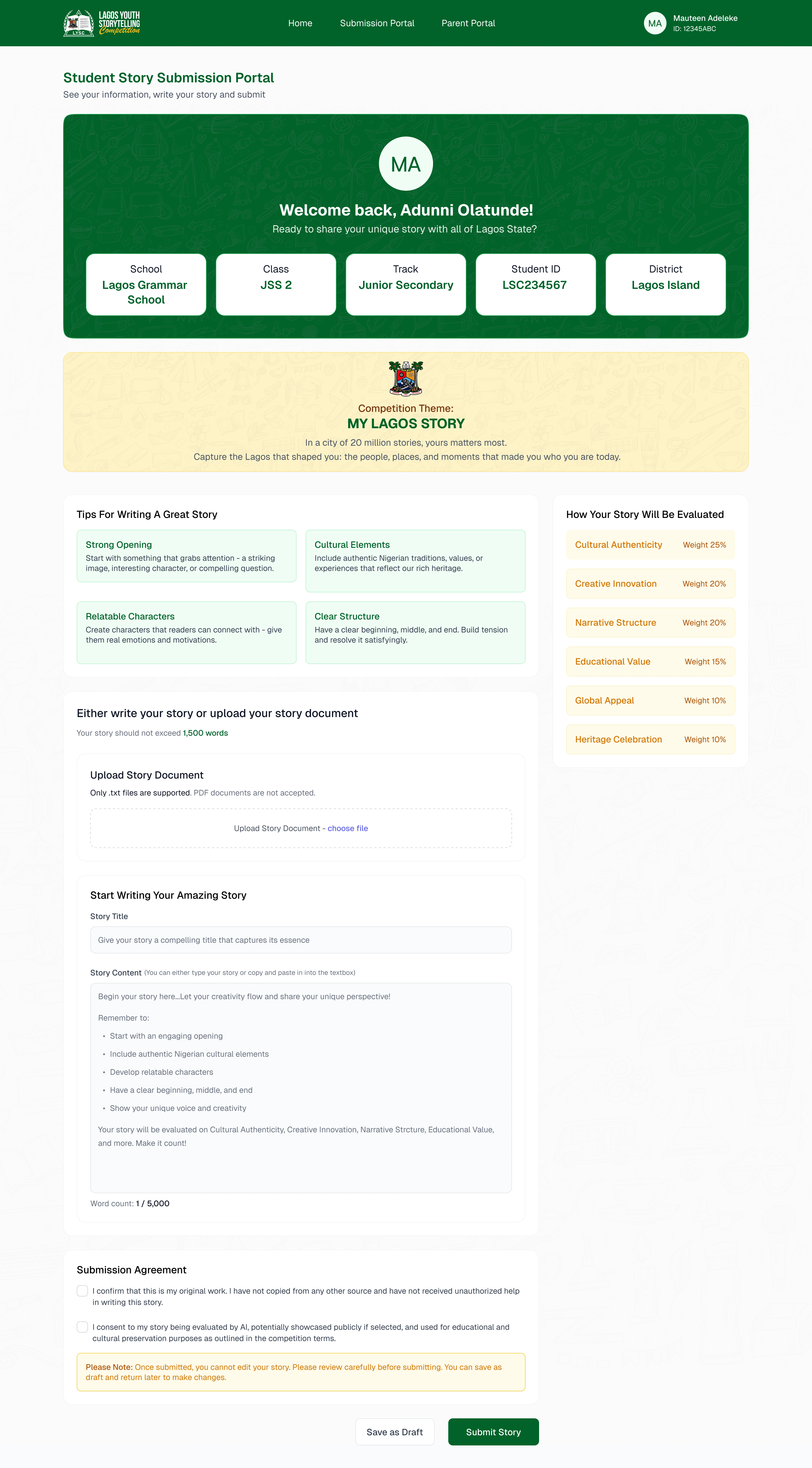 This is a web application created to support the Lagos Youth Storytelling Challenge, an initiative designed to empower young writers across Lagos State. The platform invites secondary school students to submit original stories that reflect their experiences, cultural heritage, and imaginative narratives. Through this digital experience, users can register, submit entries, and participate in a statewide creative competition that celebrates storytelling and youth expression.