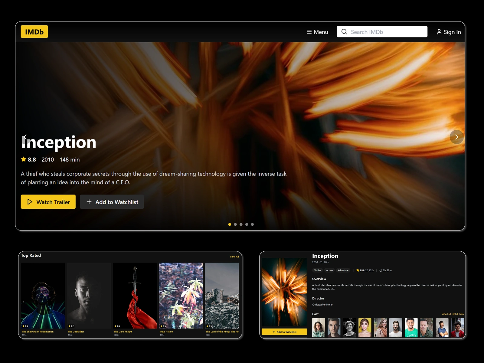 A sleek and responsive IMDb clone that lets users browse, search, and explore movies with detailed info, ratings, and a clean, responsive UI.