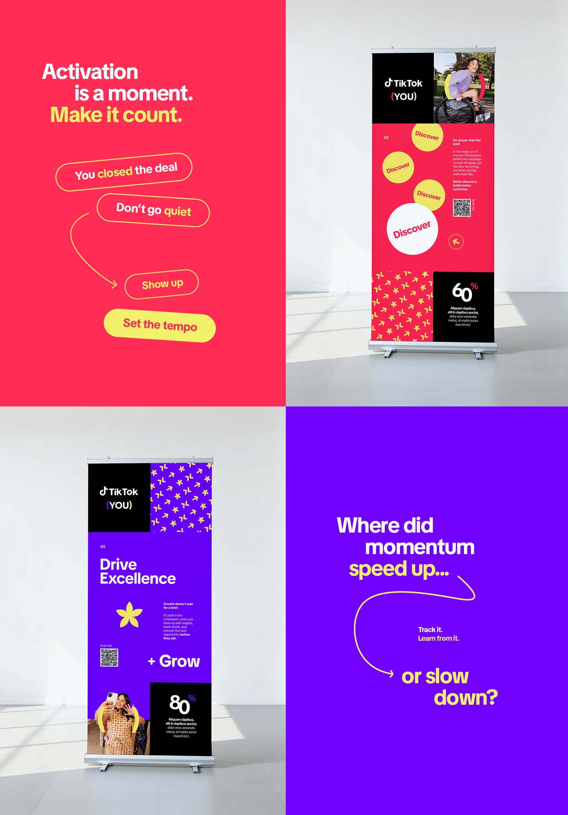 TikTok (YOU) is an event designed for the TikTok sales team. The project began with the development of moodboards, which guided the creation of a Key Visual highlighting the event’s five core content pillars. Building on this foundation, we produced a cohesive suite of event materials including pull-up banners, a large media wall, branded notebooks, discovery cards, and a series of presentation decks for the keynote speakers.