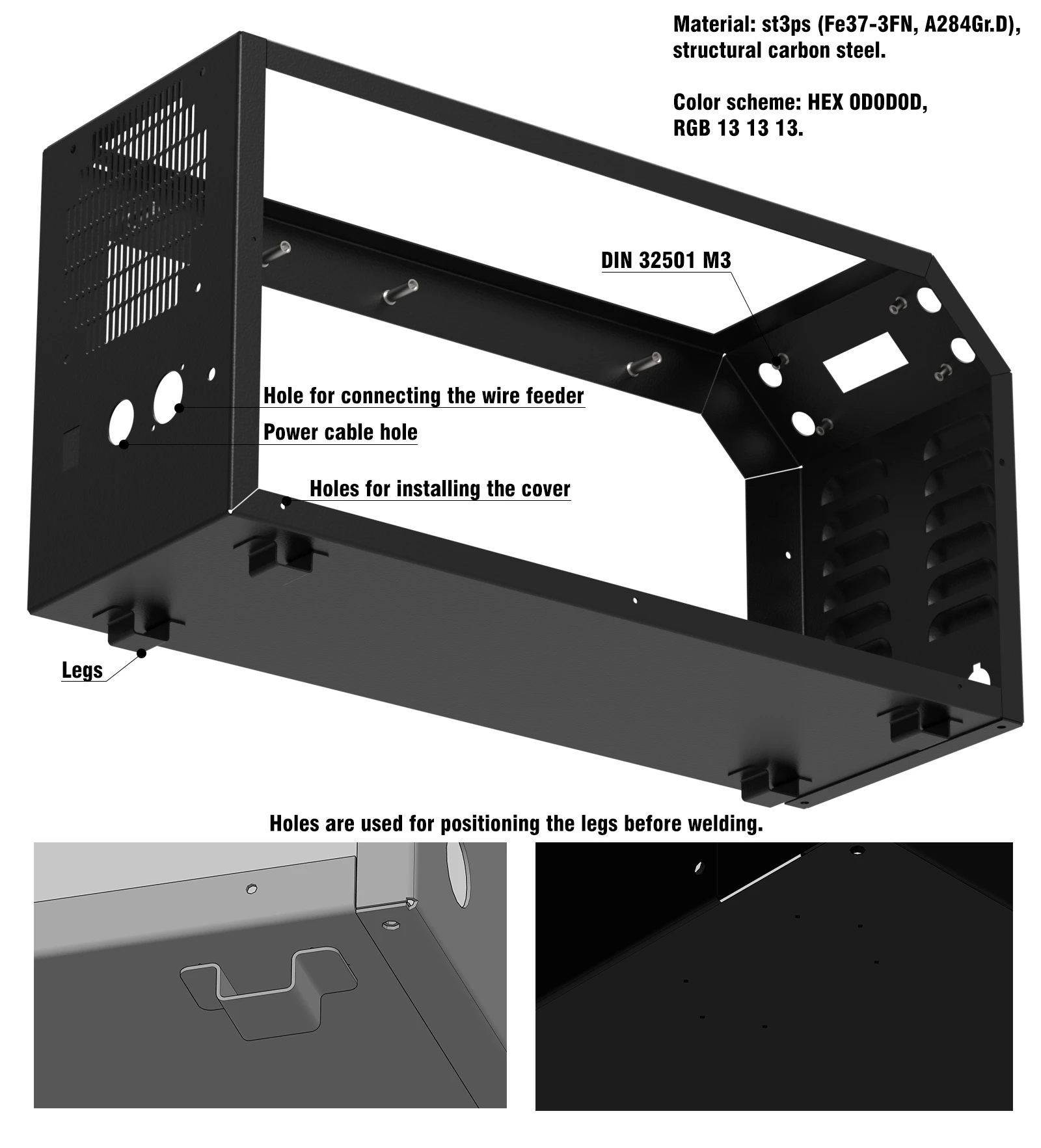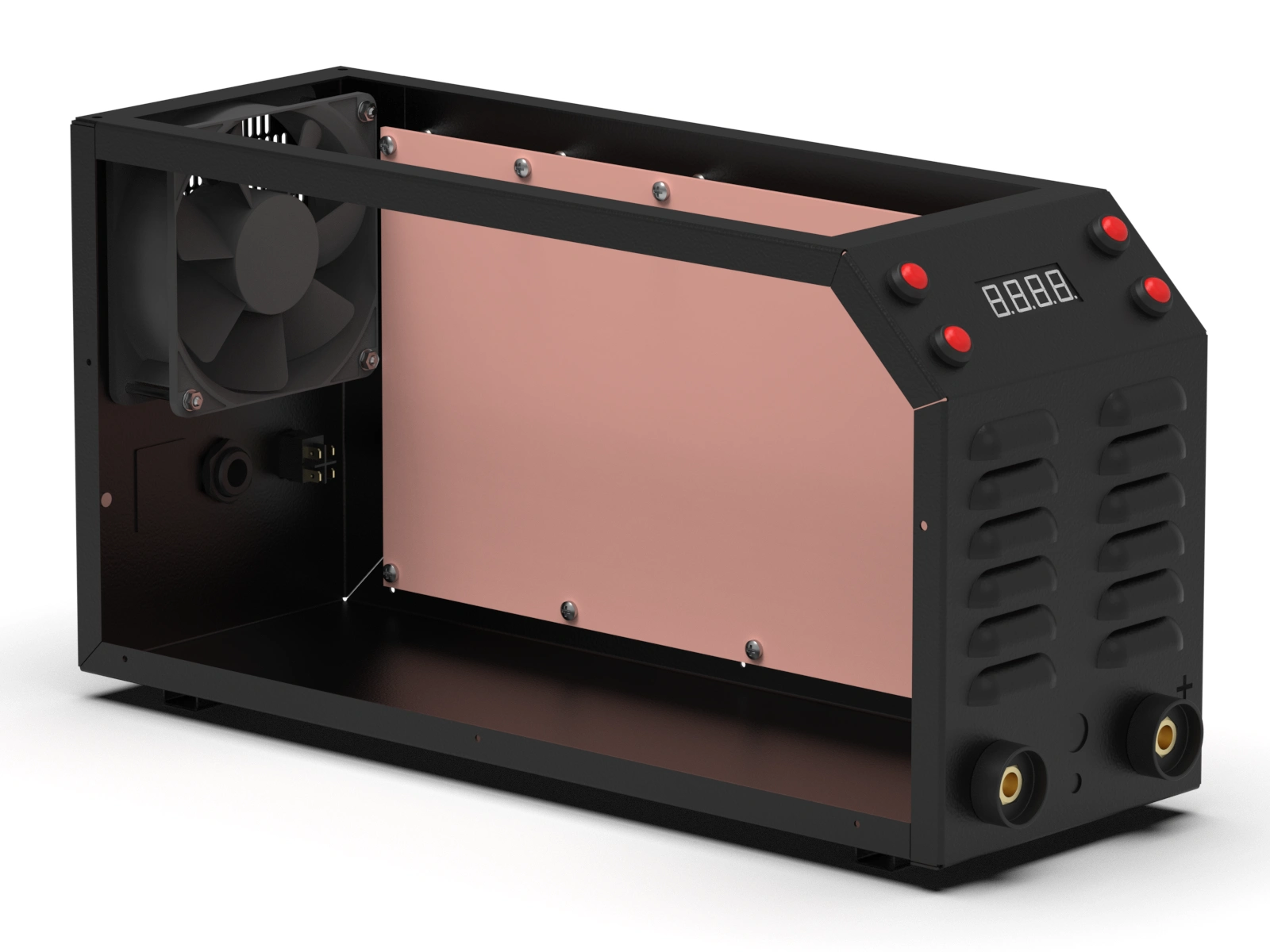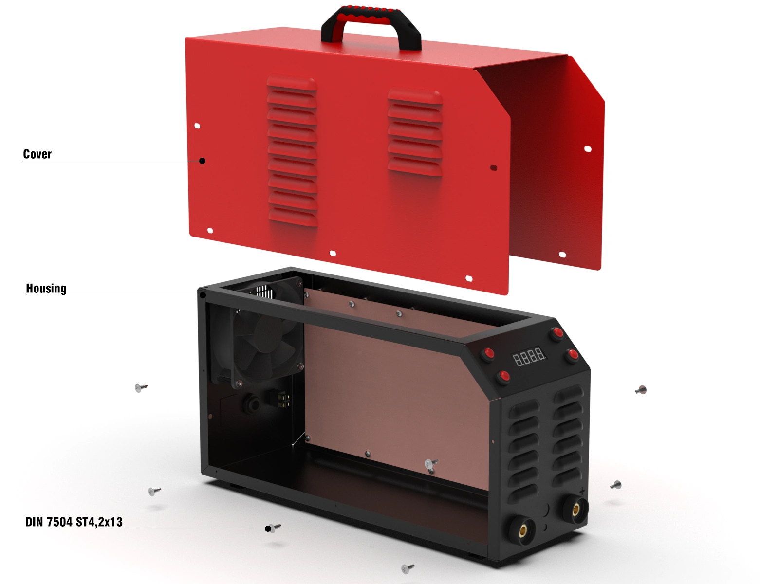 The inverter welding machine project was developed for a third-party customer and manufactured by TENKO, so the design had to meet not only the customer's requirements but also the manufacturer's (production-ready). The simple structure, use of simple materials, and mostly standard parts made it possible to adapt the body for mass production. The production of the body involved numerous technological processes, including laser cutting, sheet metal bending, punching with a bending machine, spot welding, and powder coating. Reducing the number of parts produced reduced production time and costs.