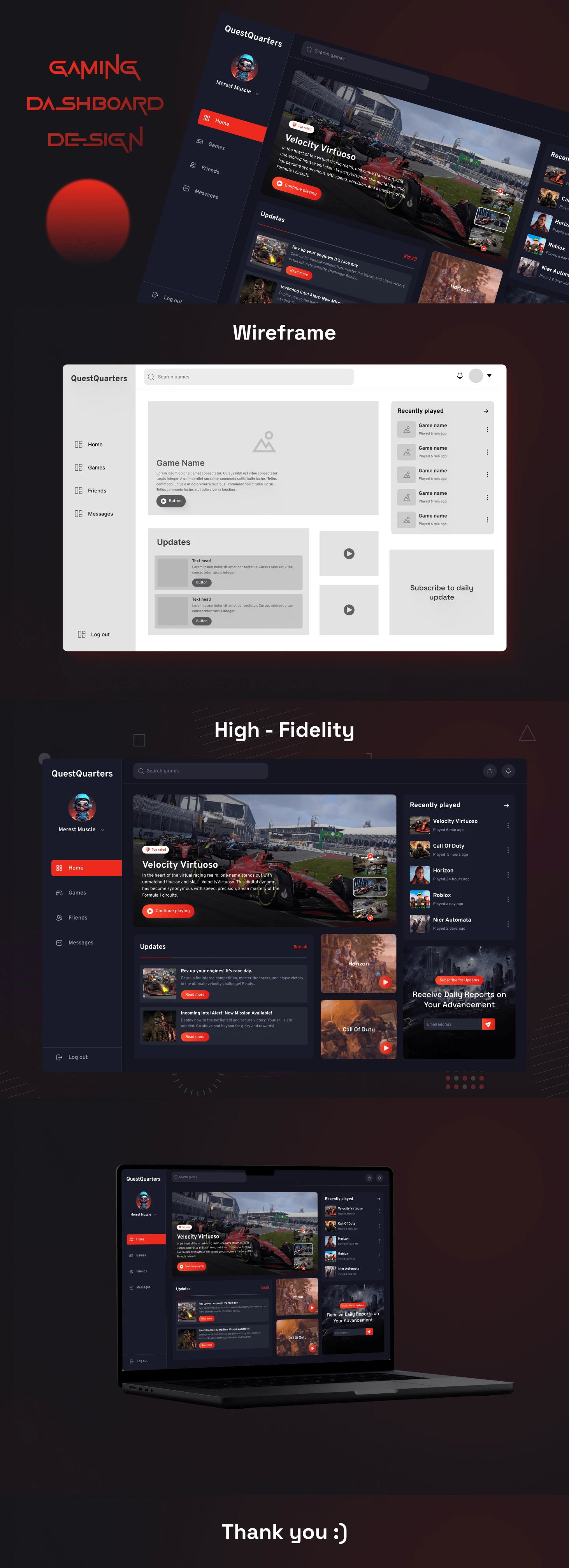 A gaming dashboard I was inspired to design, where users can browse, launch, and track their game progress, staying up-to-date on the latest news and updates.