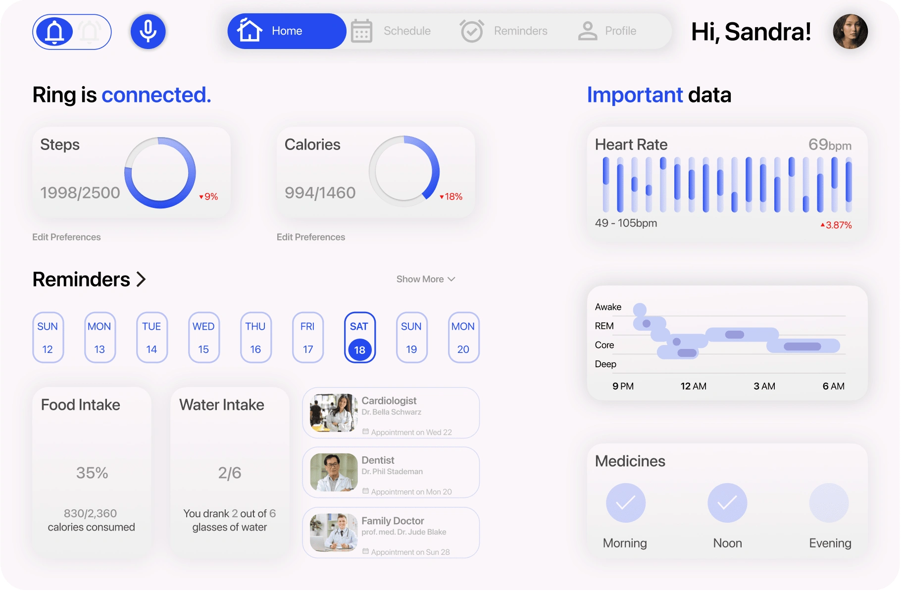 2. A Tablet Interface (Virtual Component): This is a visual dashboard that syncs with the ring, displaying health data in a clear, customizable format. The tablet provides additional functions that don’t rely on the ring, such as food and water intake tracking, medicine reminders, and appointment scheduling.