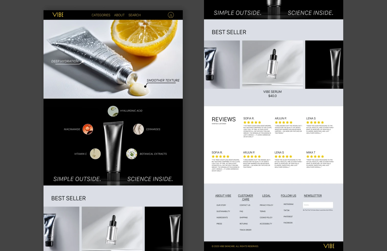 I designed this high-end landing page for VIBE, a minimalist skincare brand focused on clean ingredients and scientific performance. The layout is intentionally modern and product-focused, with soft lighting, bold product shots, and a user-centric content structure to boost trust and conversions.