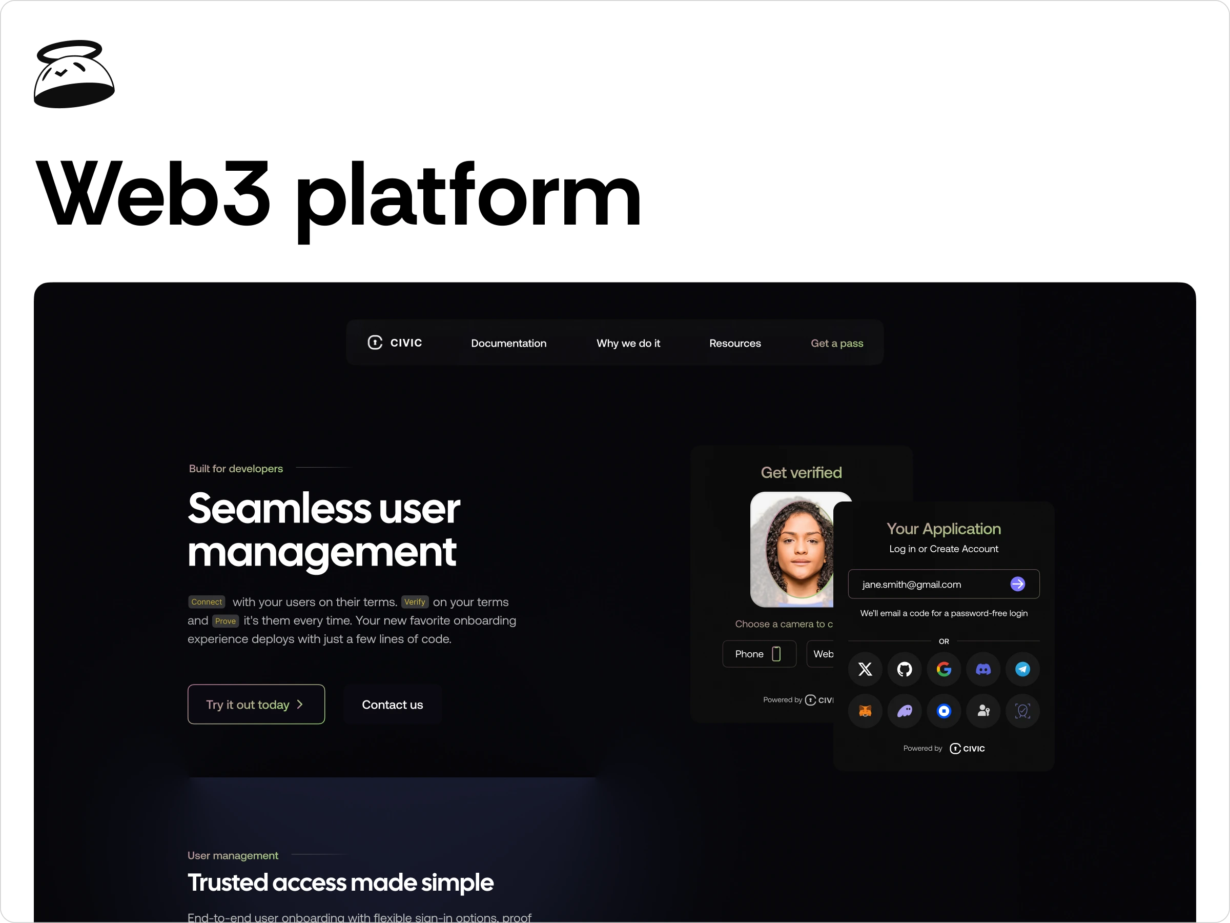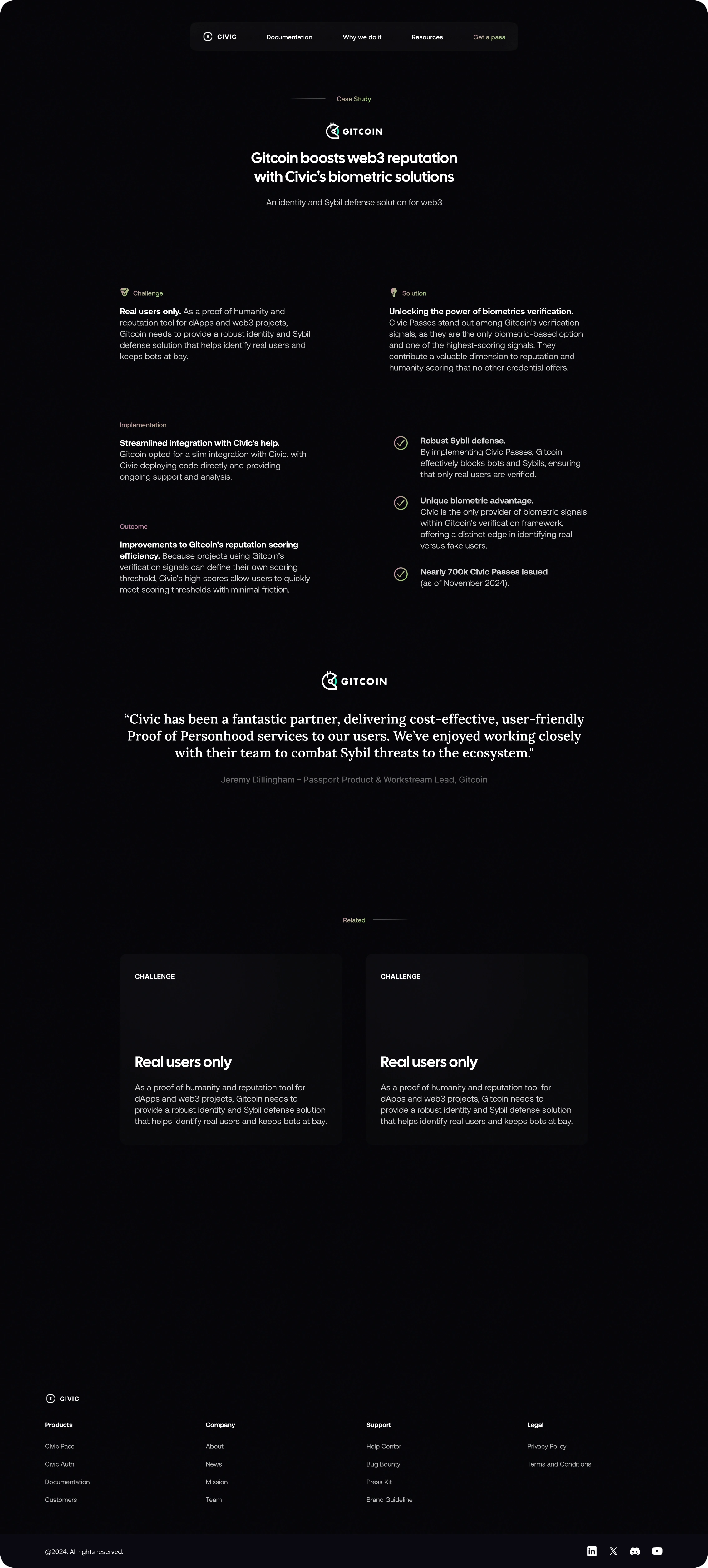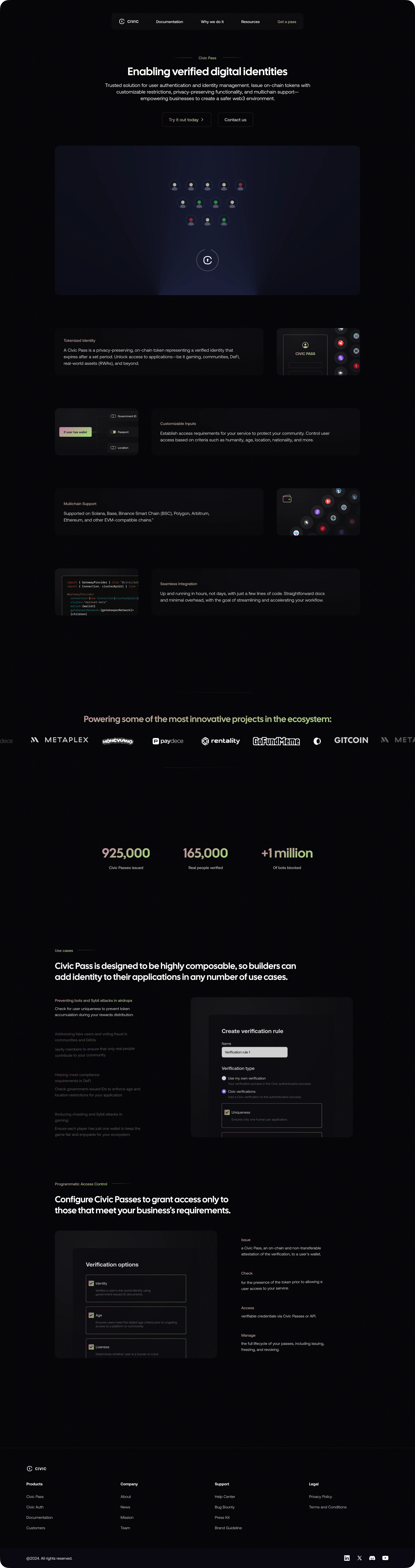 Civic provides secure, privacy-preserving identity verification and authentication for businesses worldwide. I redesigned the marketing website and key product pages to clarify positioning, explain complex features (KYC, liveness, passkeys), and guide different audiences—product, compliance, and developers—toward action with less friction.