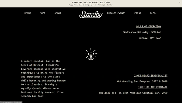 Standby, a distinguished high-end craft cocktail lounge and Modern American gastropub, approached us with a vision: to create an enticing digital platform that reflects the sophistication of their establishment and promotes their various public events. The challenge was to design a dynamic website showcasing their continually evolving menu, culinary artistry, and signature craft cocktails. Our task included integrating an easy-to-use reservation system, highlighting their accolades, past events, private event services, and introducing innovative features like cocktail-to-go ordering.