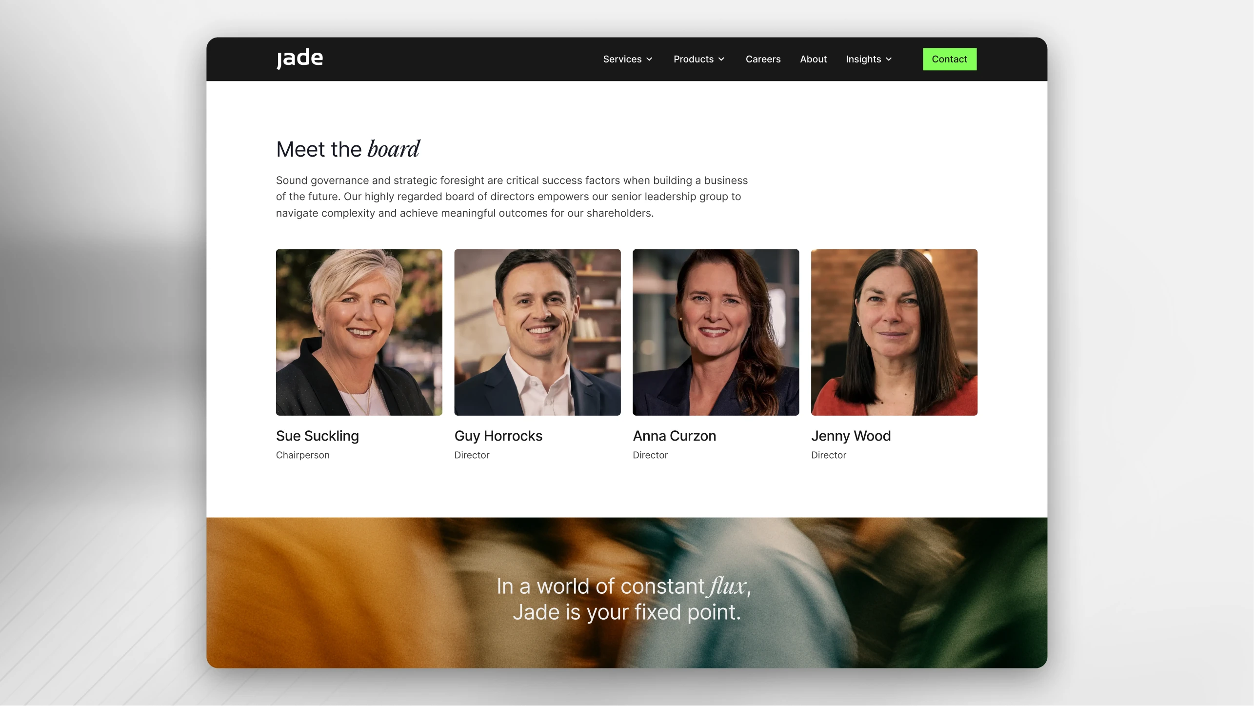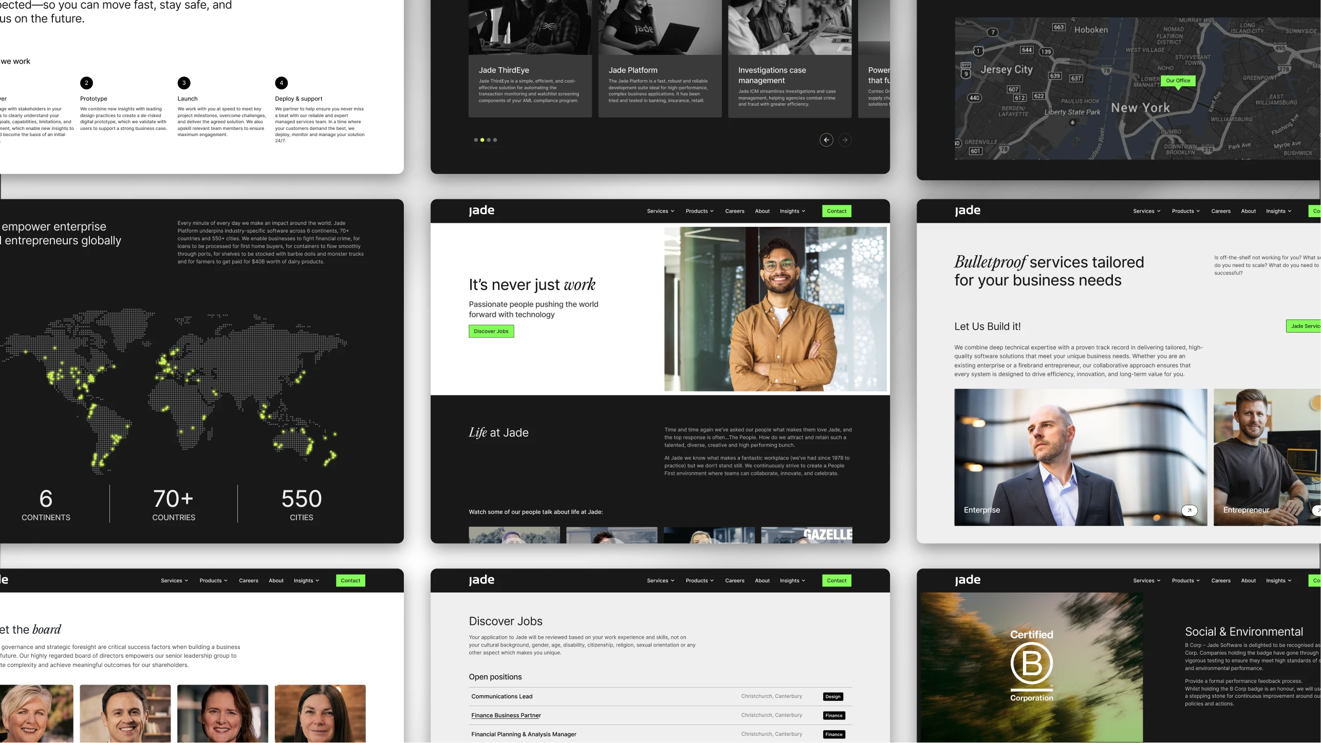 Jade software underwent a rebrand to revitalise its market presence and better highlight its products powering leading brands. The core challenge was translating a mature, resilient, and confident brand identity into a website that represented those values with a systematic design for colour, layout, imagery, and messaging. The site also needed to launch quickly, so an agile page-by-page rollout was used.