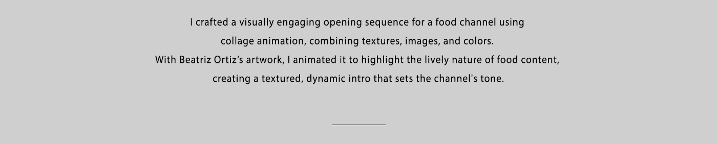 Created a vibrant food channel intro using collage animation with Beatriz Ortiz’s artwork, blending textures and colors to set a lively, dynamic tone.