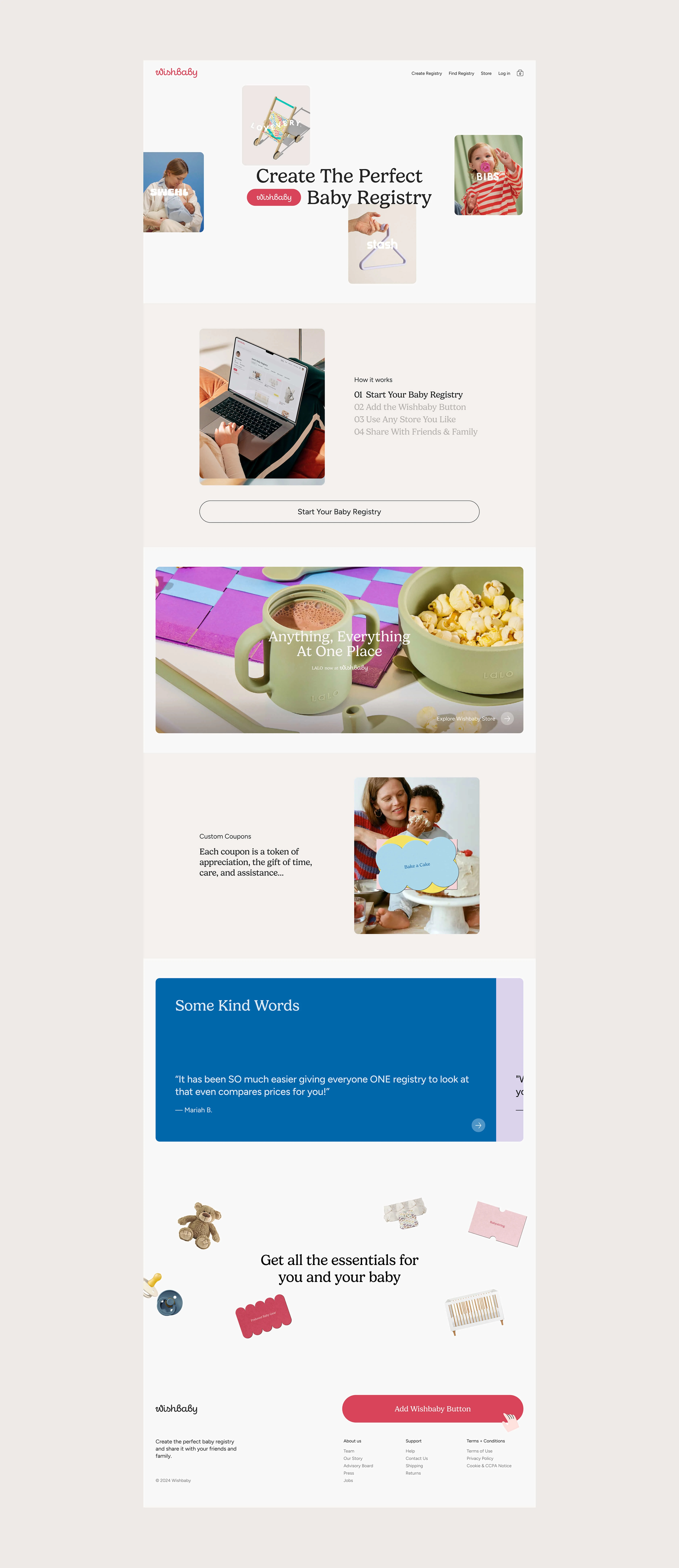 Our role was to make Wishbaby feel like a warm hug. The color palette, anchored by the inviting hue of 'Amaranth' imbues the platform with a sense of comfort and joy while maintaining an air of elegance. For the headlines, we selected a smooth-edges serif font, to make them stand out and for the body, we went with a simple and easy-to-read font, making it the perfect combo.