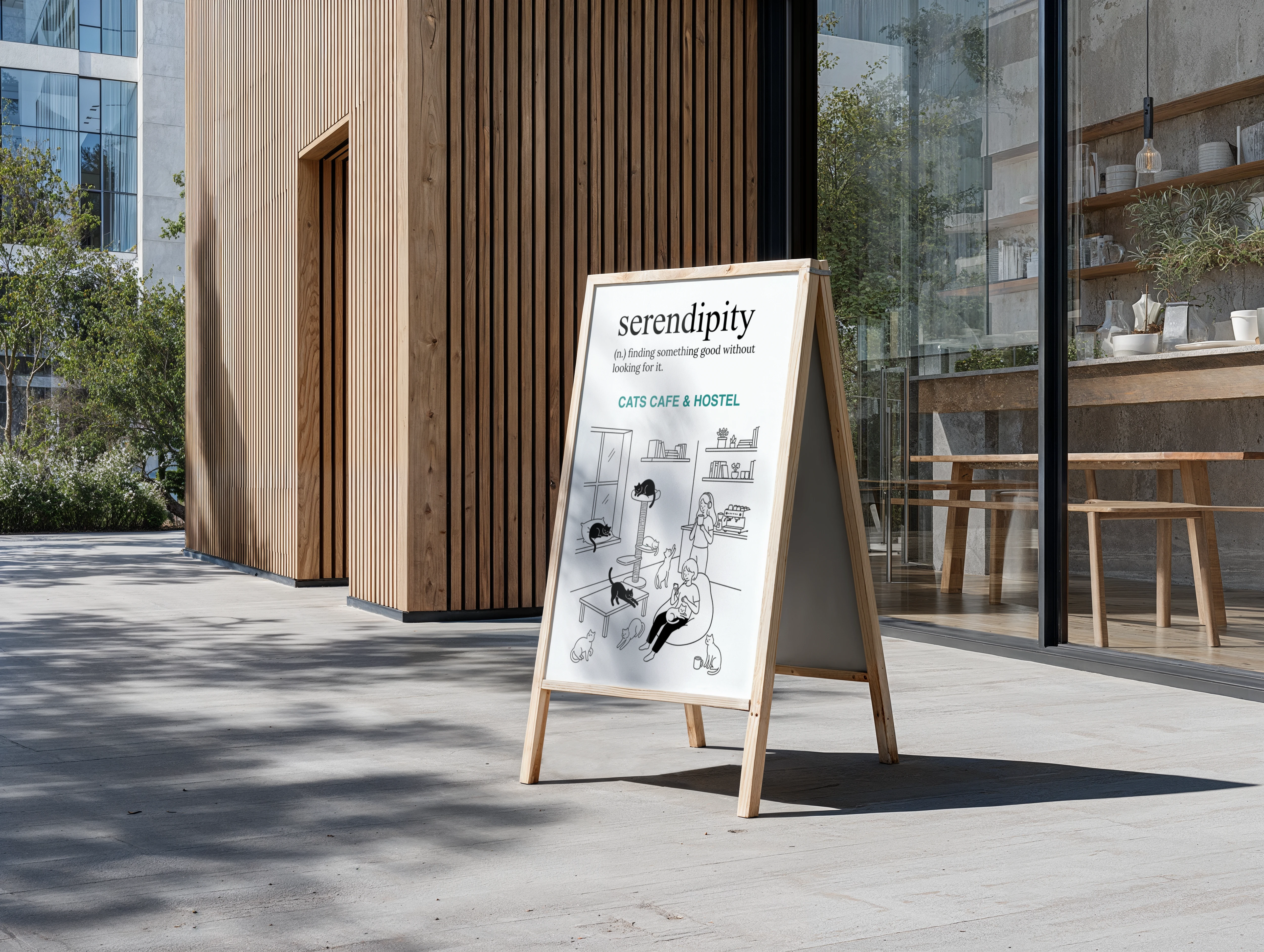 Serendipity Rishikesh, a new establishment combining a cats cafe, hostel, and thrift store, required a cohesive visual identity to launch its unique concept. The goal was to create a range of branding materials that would capture their unique, welcoming vibe and stand out to both locals and tourists in the busy hub of Rishikesh.