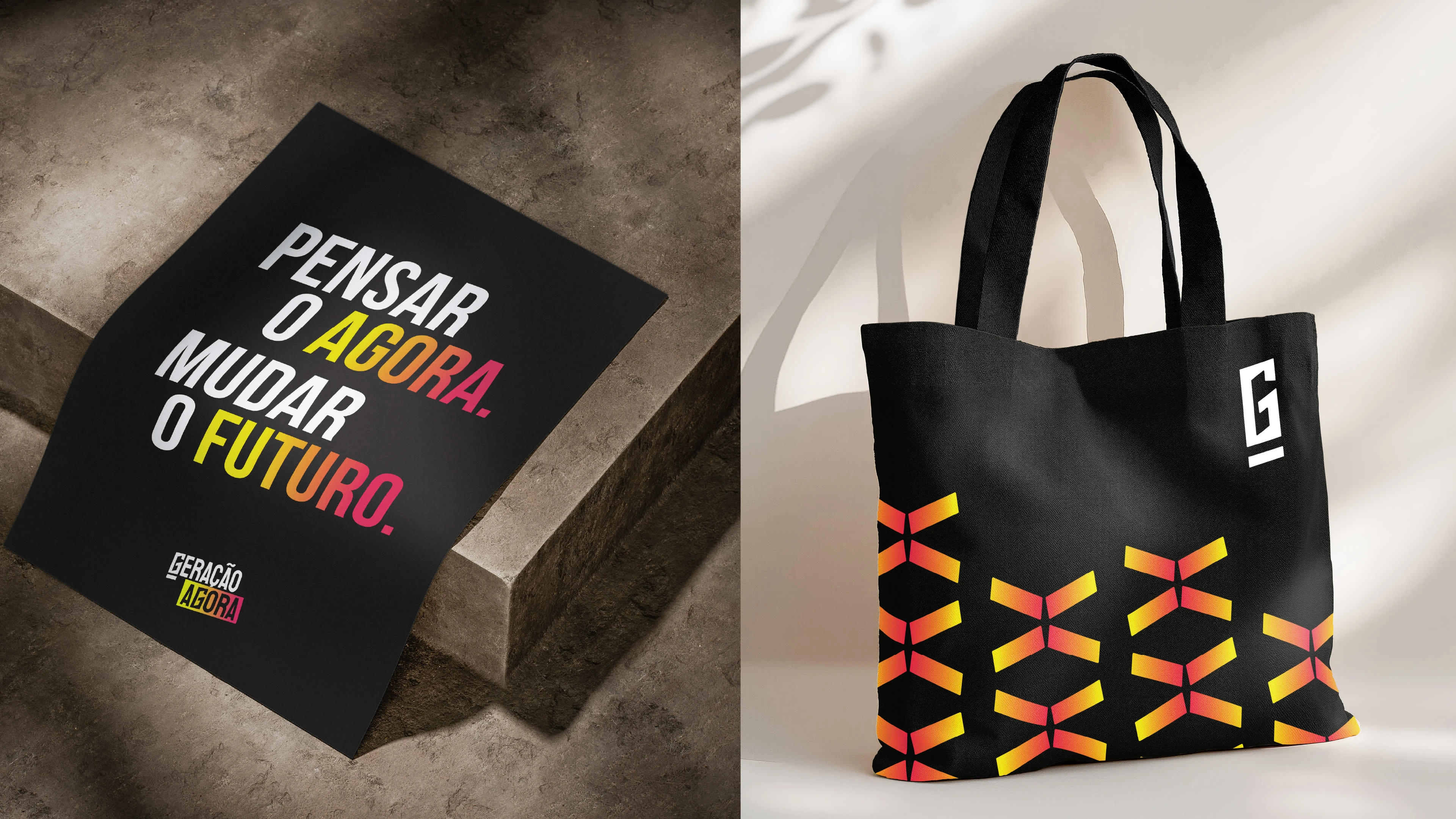 It also functions as an independent icon, adaptable for digital use and social media. The word “AGORA” sits inside a rectangular gradient field, emphasizing the now — a spotlight of the present moment, calling attention to movement, progress, and transformation.