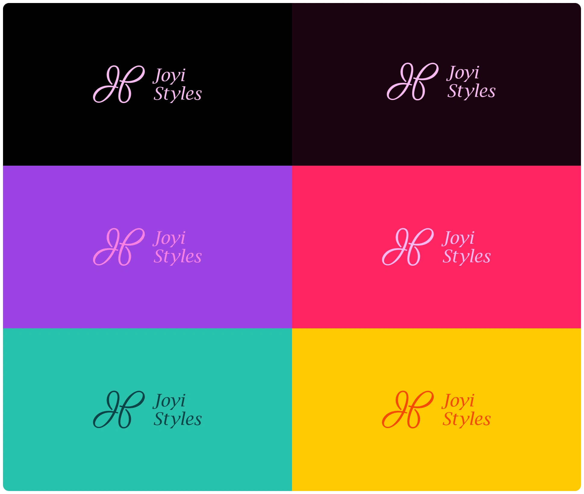 Secondary colors include yellow-green, ice blue, and purple, which are earthy tones that complement the primary colors. Yellow-green represents growth, renewal, and a connection to nature, echoing the brand’s eco-friendly values and sustainable practices. Ice blue conveys tranquility and calmness, enhancing the sense of comfort and ease that Joyi Styles' garments provide. Purple symbolizes creativity, depth, and luxury, further reinforcing the brand’s sophisticated and elegant image.