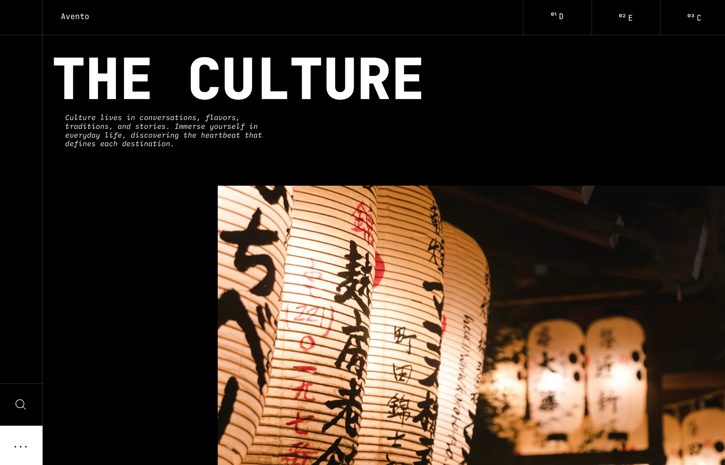 Typography plays a vital role in setting the tone. The pairing of monospaced accents with strong sans-serif headlines gives the brand a timeless, global character, while still feeling contemporary. The dark, minimal frame around the content keeps navigation subtle, ensuring that users are always immersed in the visuals.