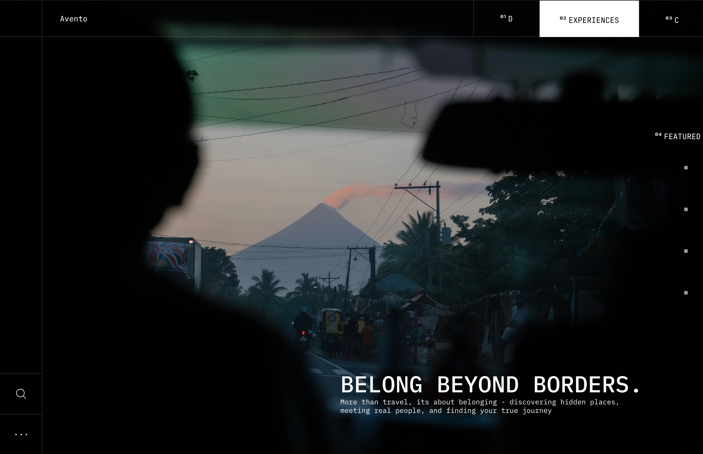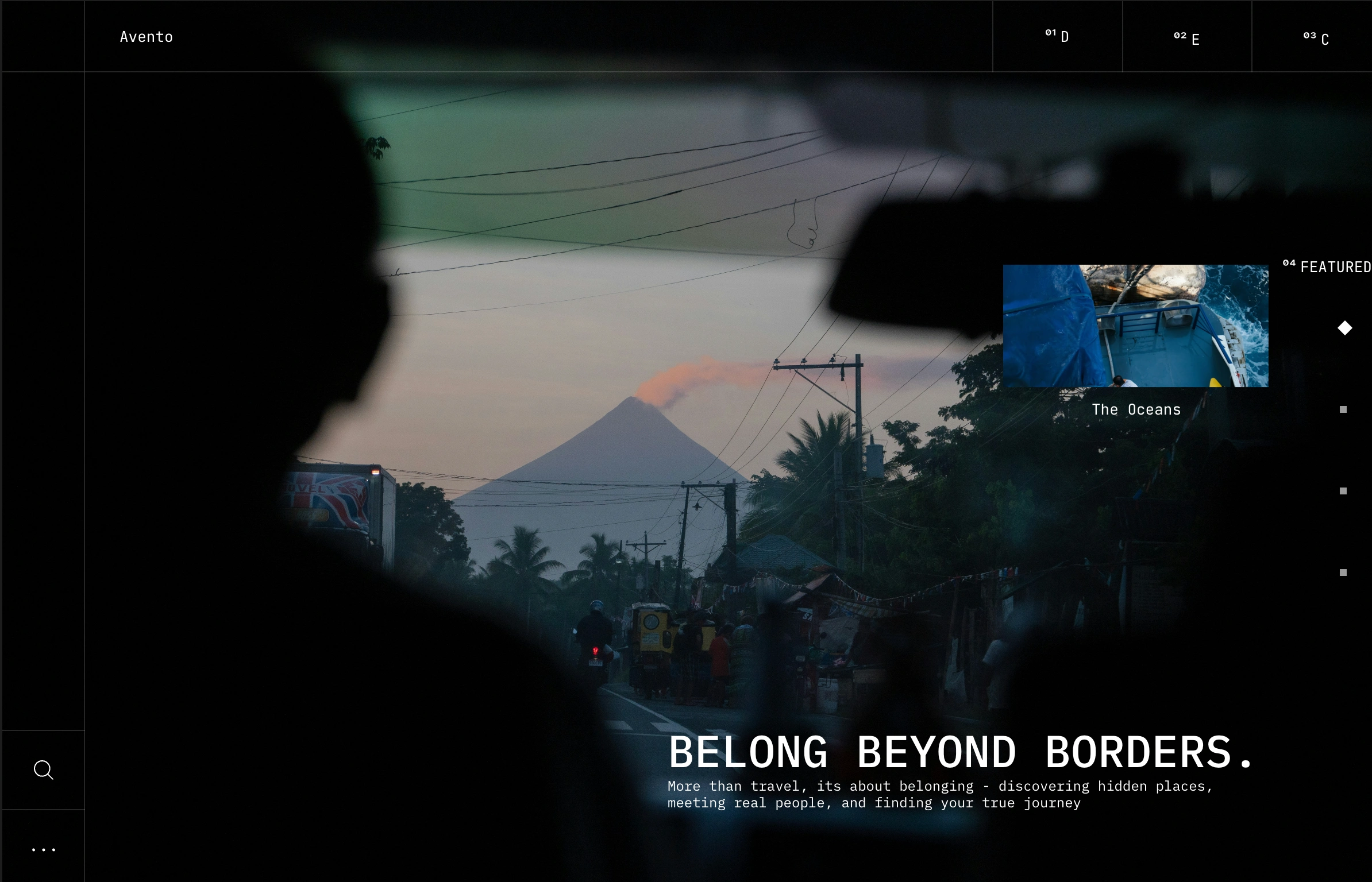 The landing page introduces Avento, a modern travel agency experience built with Framer. The design takes a cinematic approach — wide, moody visuals and immersive storytelling that transport visitors straight into the journey. Anchored by the headline “Belong Beyond Borders”, the site emphasizes more than destinations: it’s about connection, discovery, and the feeling of finding home anywhere in the world.