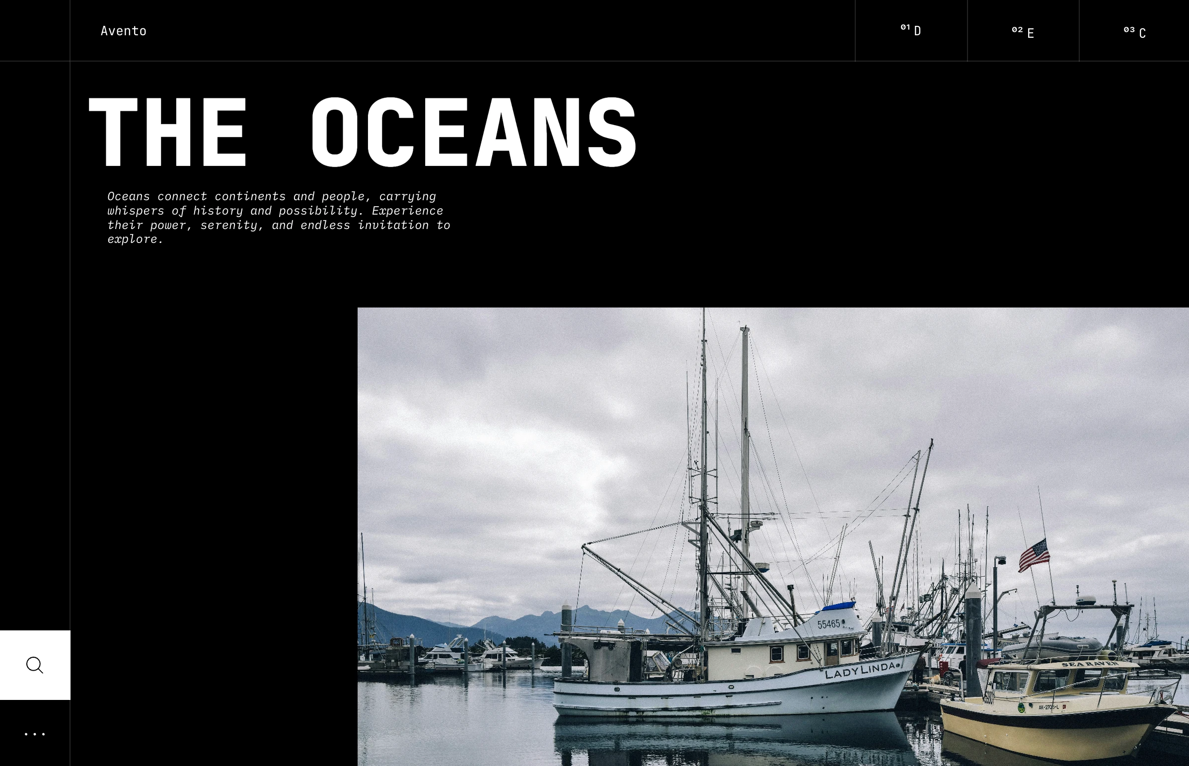 The structure is clean but atmospheric. I designed an editorial-style layout that guides users through key thematic chapters — The Oceans, The Culture, and beyond. Each section opens with bold typography and expansive imagery, creating an almost magazine-like rhythm. The use of space and contrast ensures the focus stays on the photography, while the text provides just enough narrative to spark curiosity.