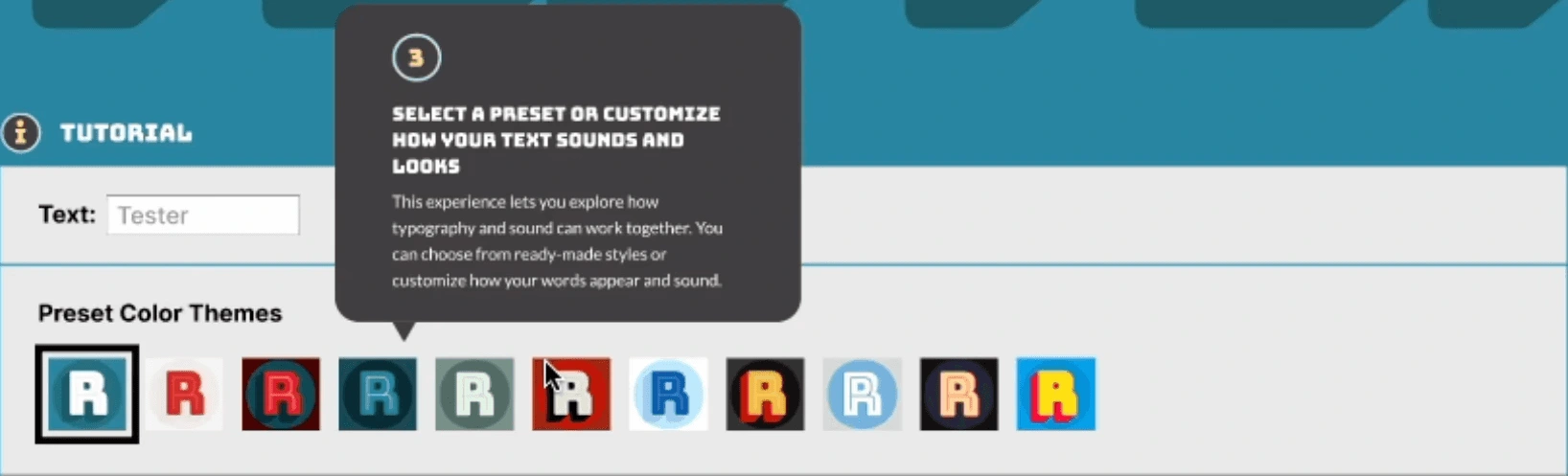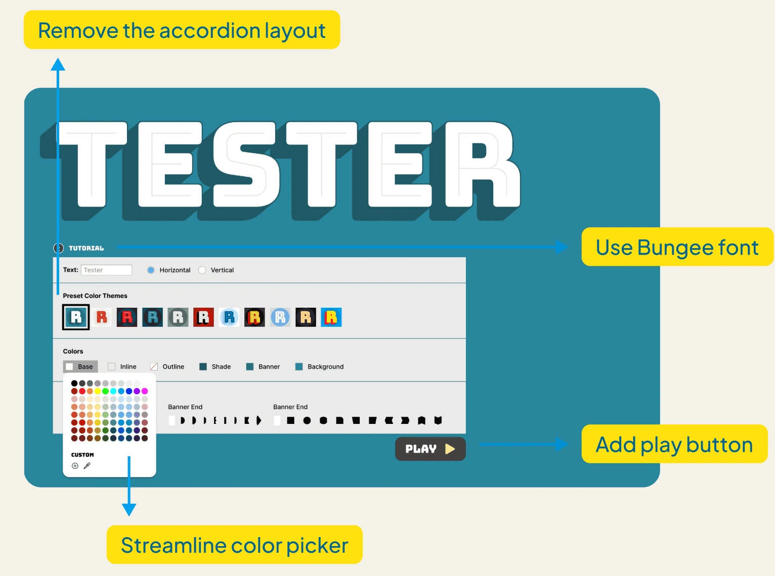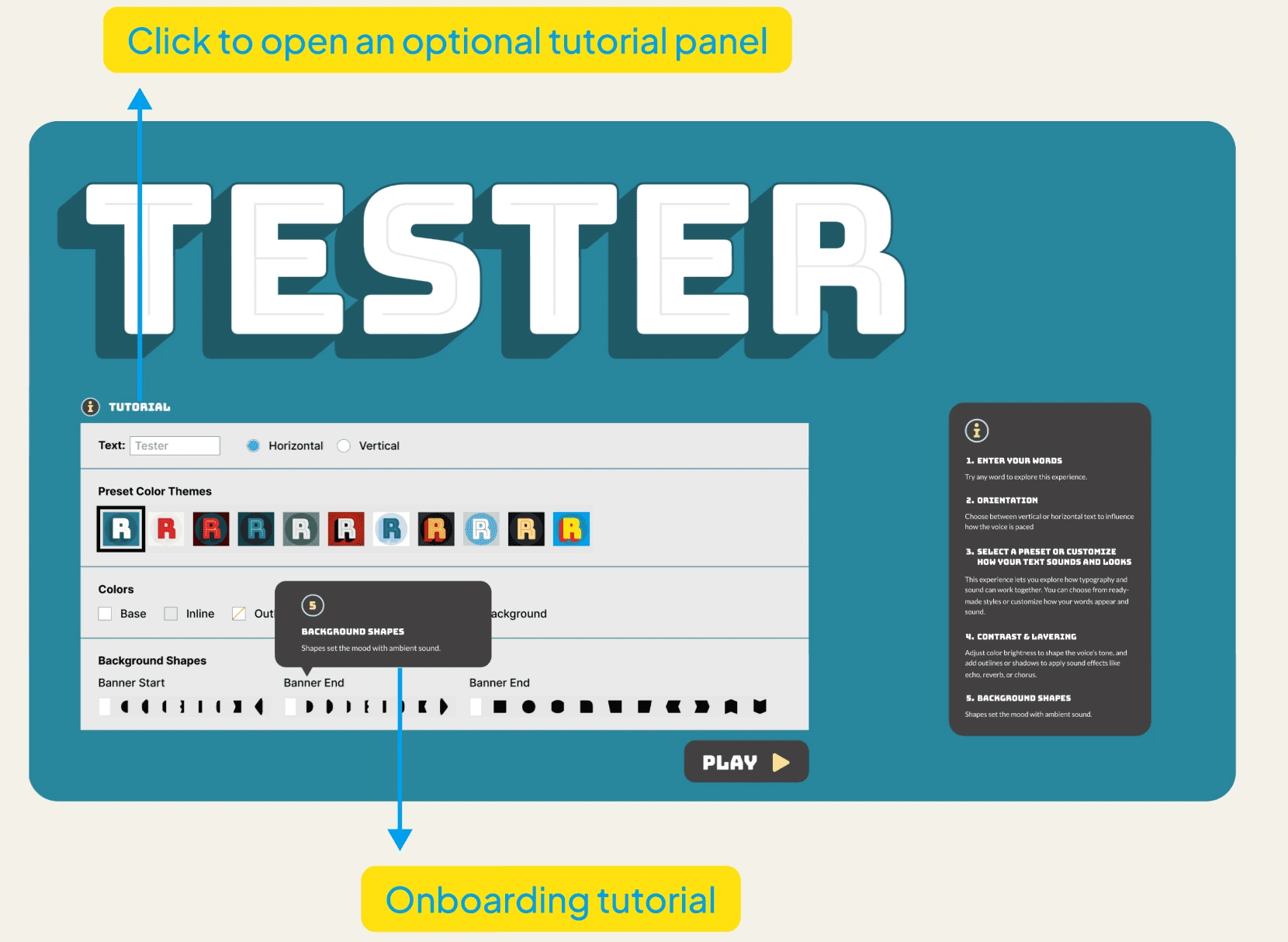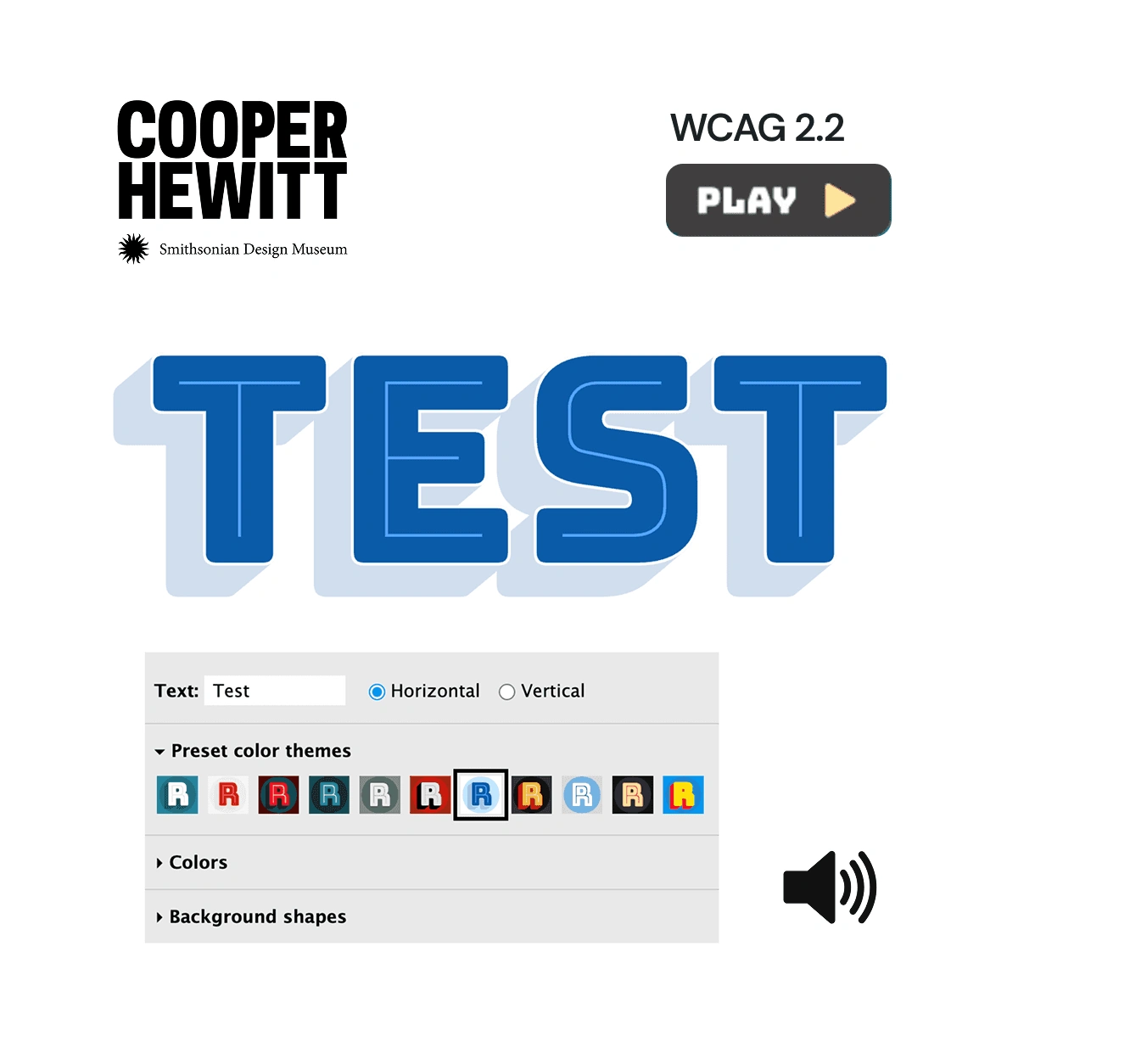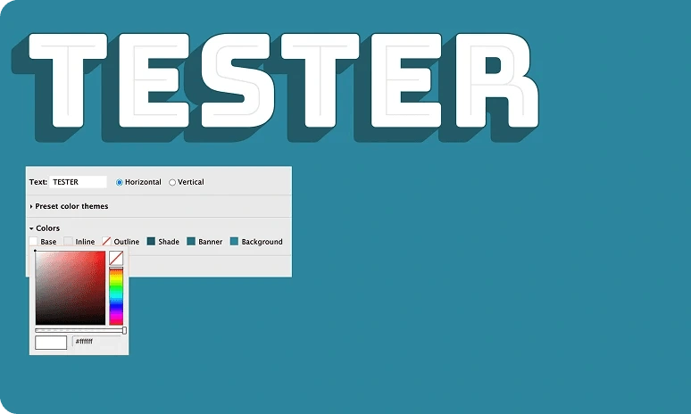 The font tester includes text, horizontal or vertical orientation, preset color themes, colors, and background shapes.