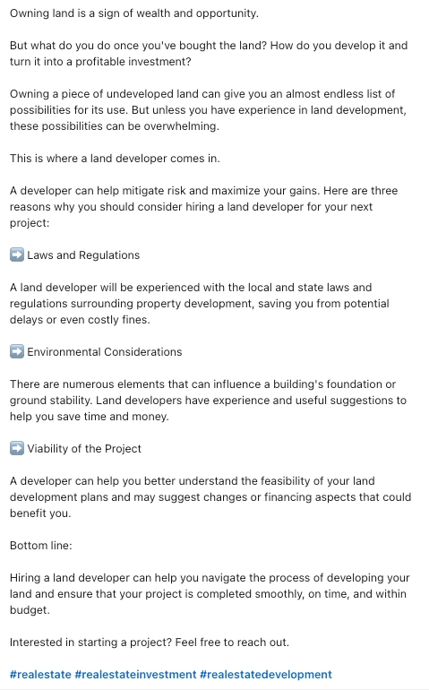 An agency needed someone to write LinkedIn posts for a client who is in the Real Estate and Land Development industry that was informative, educational, and to the point without all the typical marketing fluff.