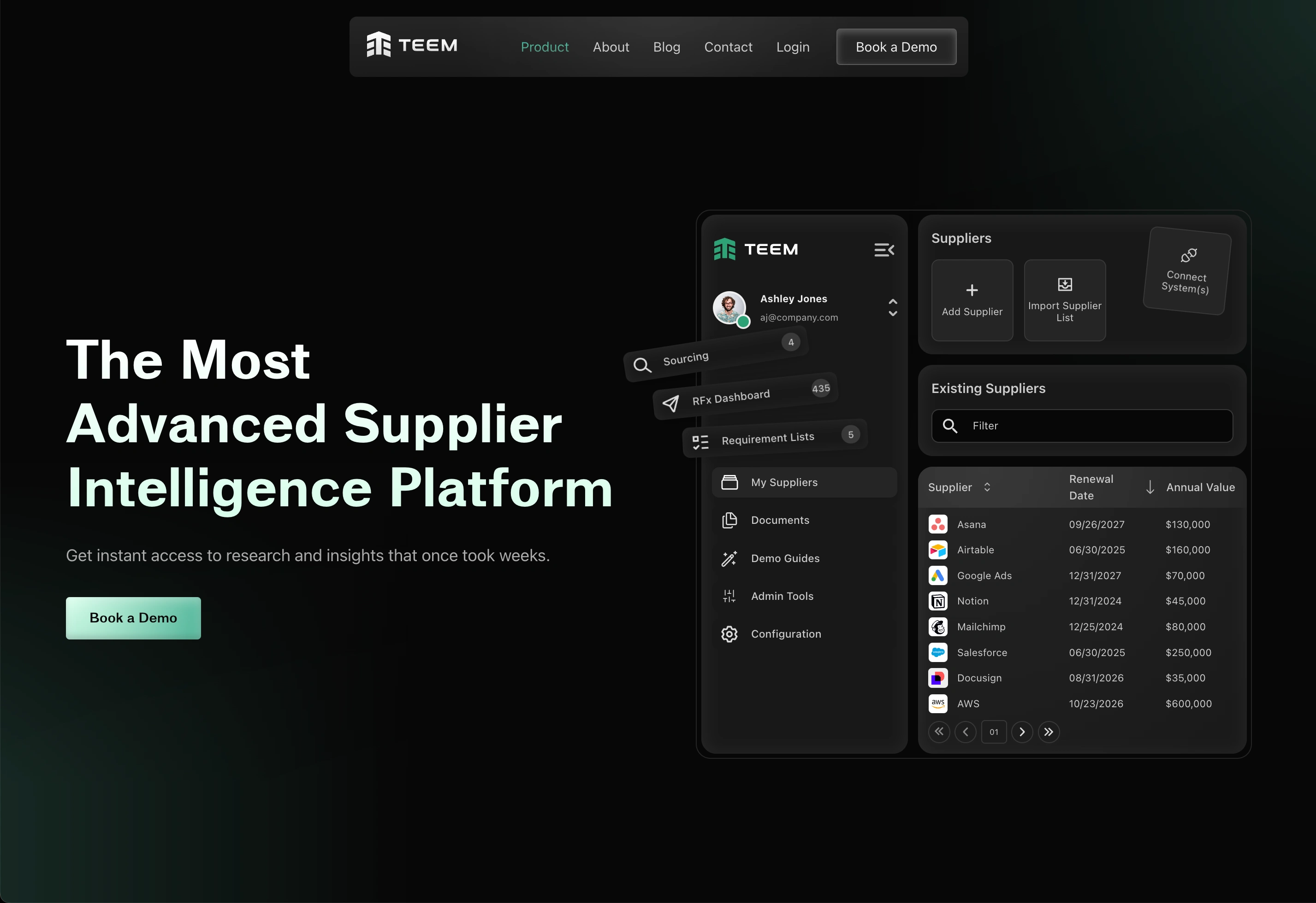 Teem, a company specializing in AI-driven solutions, needed a website that reflected its innovative technology while engaging its target audience—software procurement teams in large corporations. With limited initial content input from the client, we took the lead in defining the website’s structure, messaging, and visual identity to align with their high-tech offerings and professional audience.