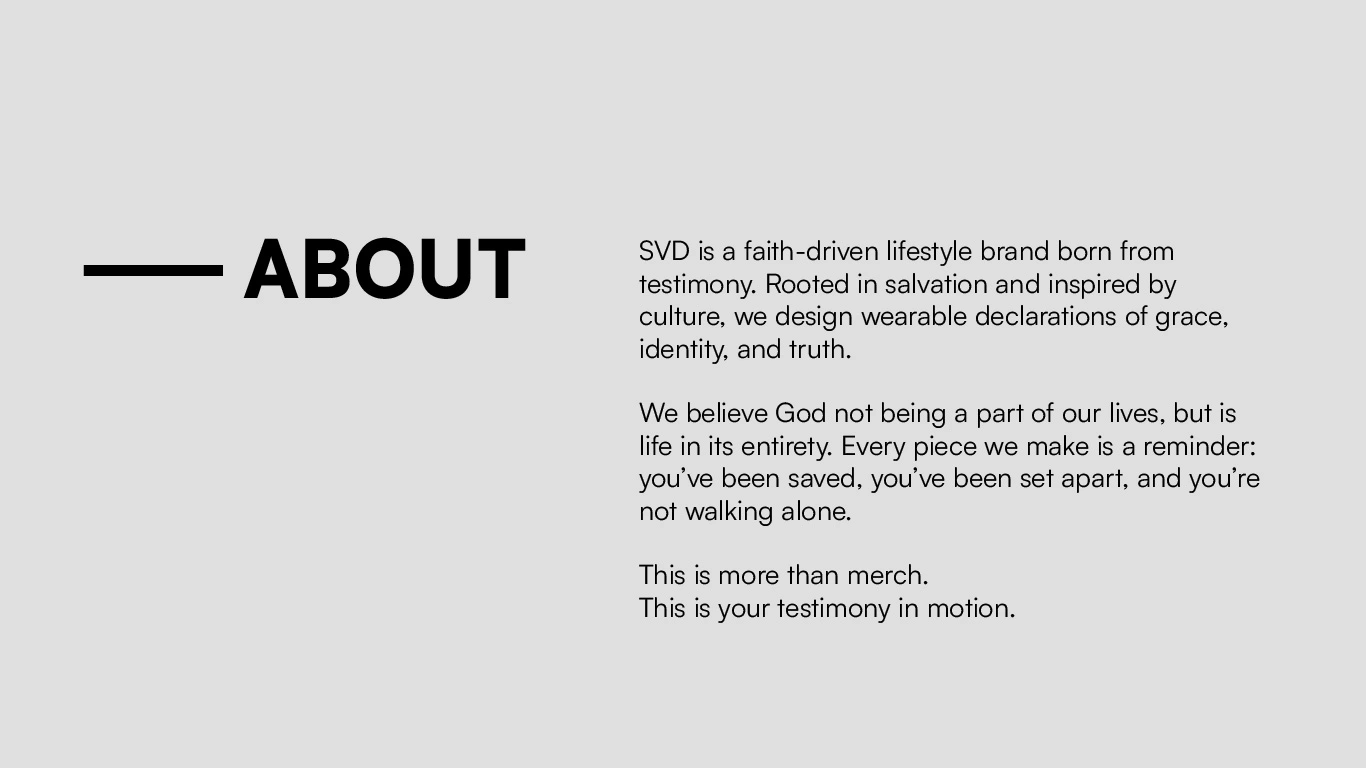 SVD is a contemporary, faith-driven streetwear and lifestyle brand rooted in Christian values. Their mission is to boldly share the gospel through fashion and visual storytelling that speaks to a new generation—unapologetically and unashamed.