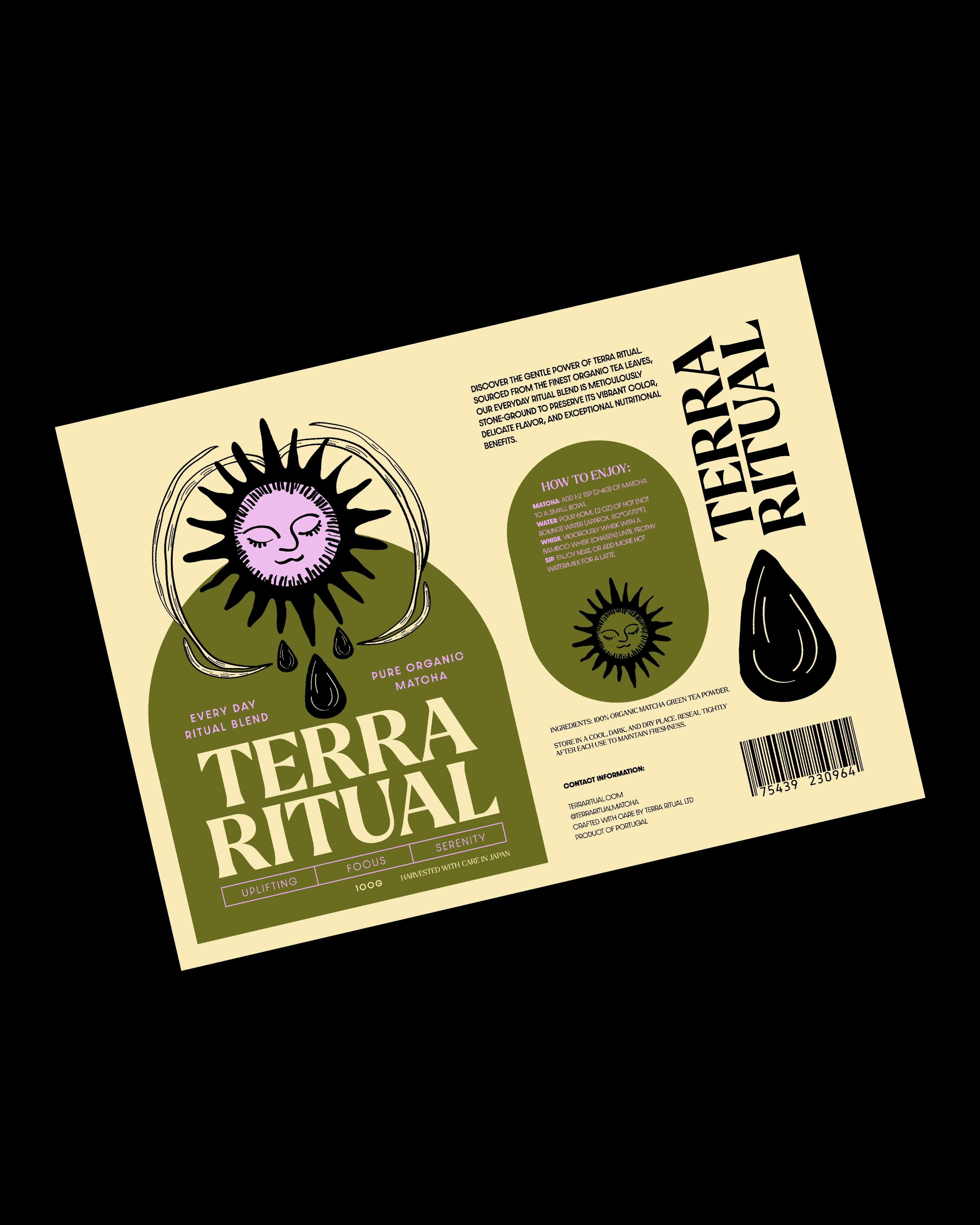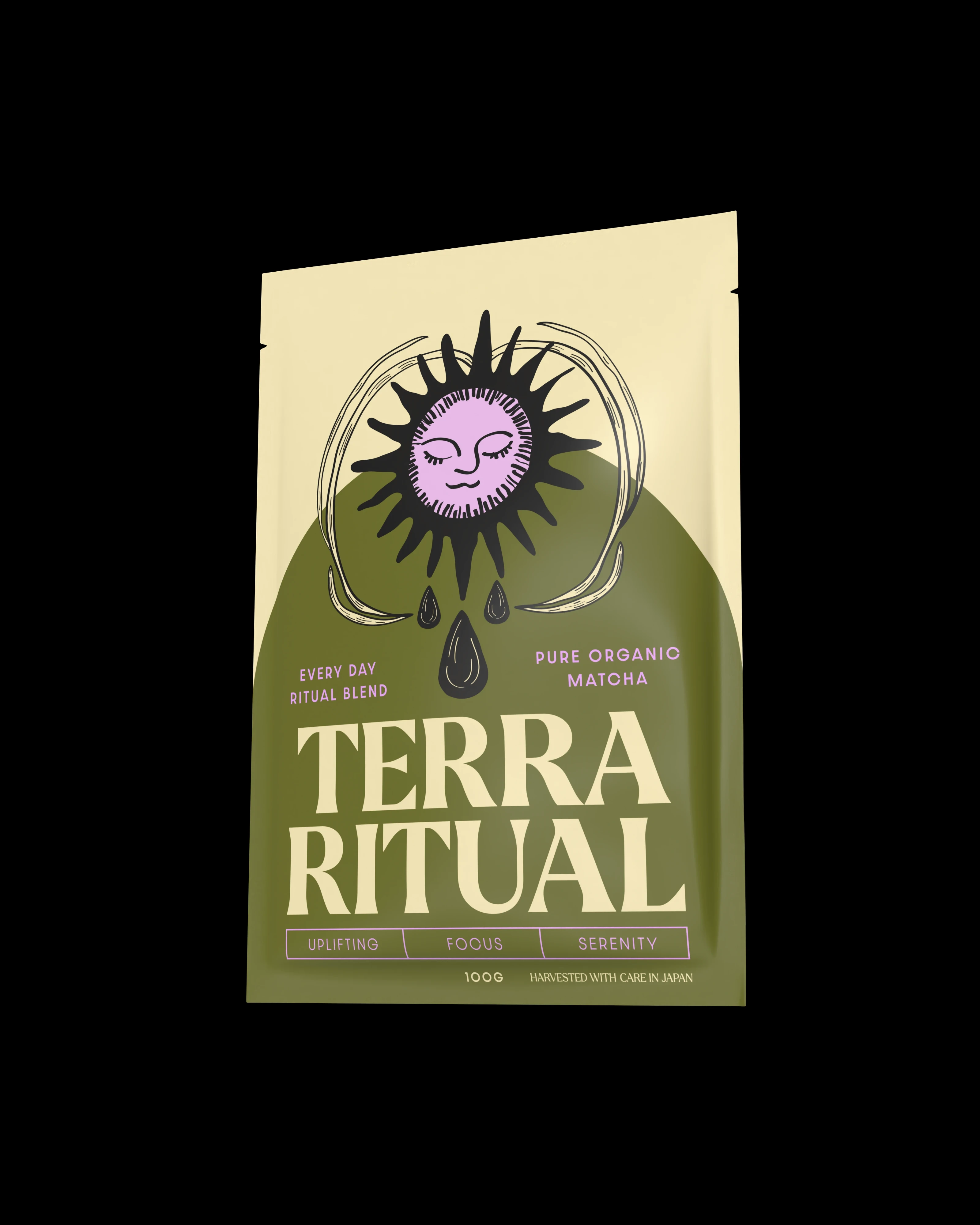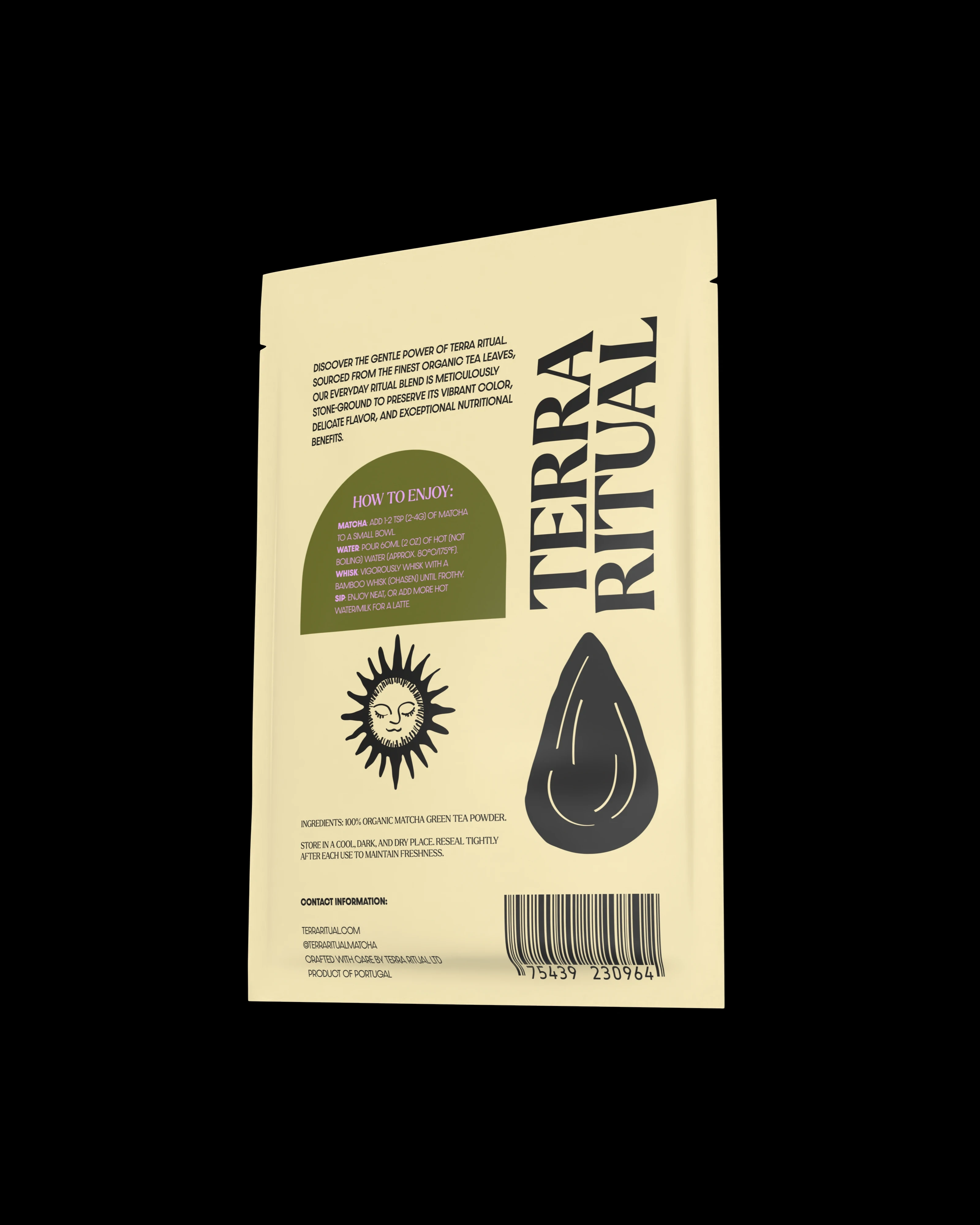 Terra Ritual is an organic matcha brand seeking to elevate the daily tea ritual into a moment of intentional focus and serenity. I created a packaging that communicates both its premium organic quality and its deep, grounding benefits. The design utilizes a sophisticated, nature-inspired palette and a bold serif typeface for the brand name, creating a powerful contrast that positions Terra Ritual as a modern, trustworthy, and visually distinctive player in the wellness space.
