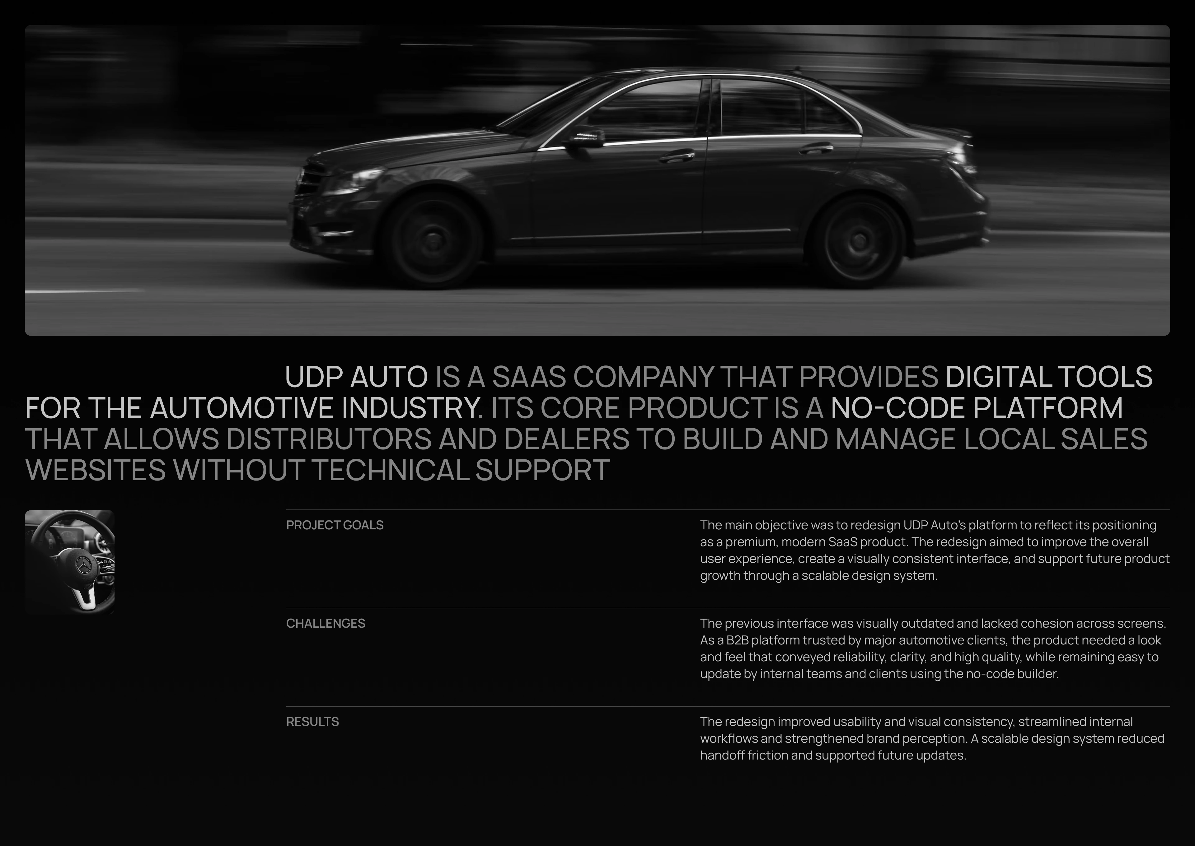 Redesigned UDP Auto’s SaaS platform to elevate UX, build a scalable design system, and reflect a premium, reliable image for B2B automotive clients.