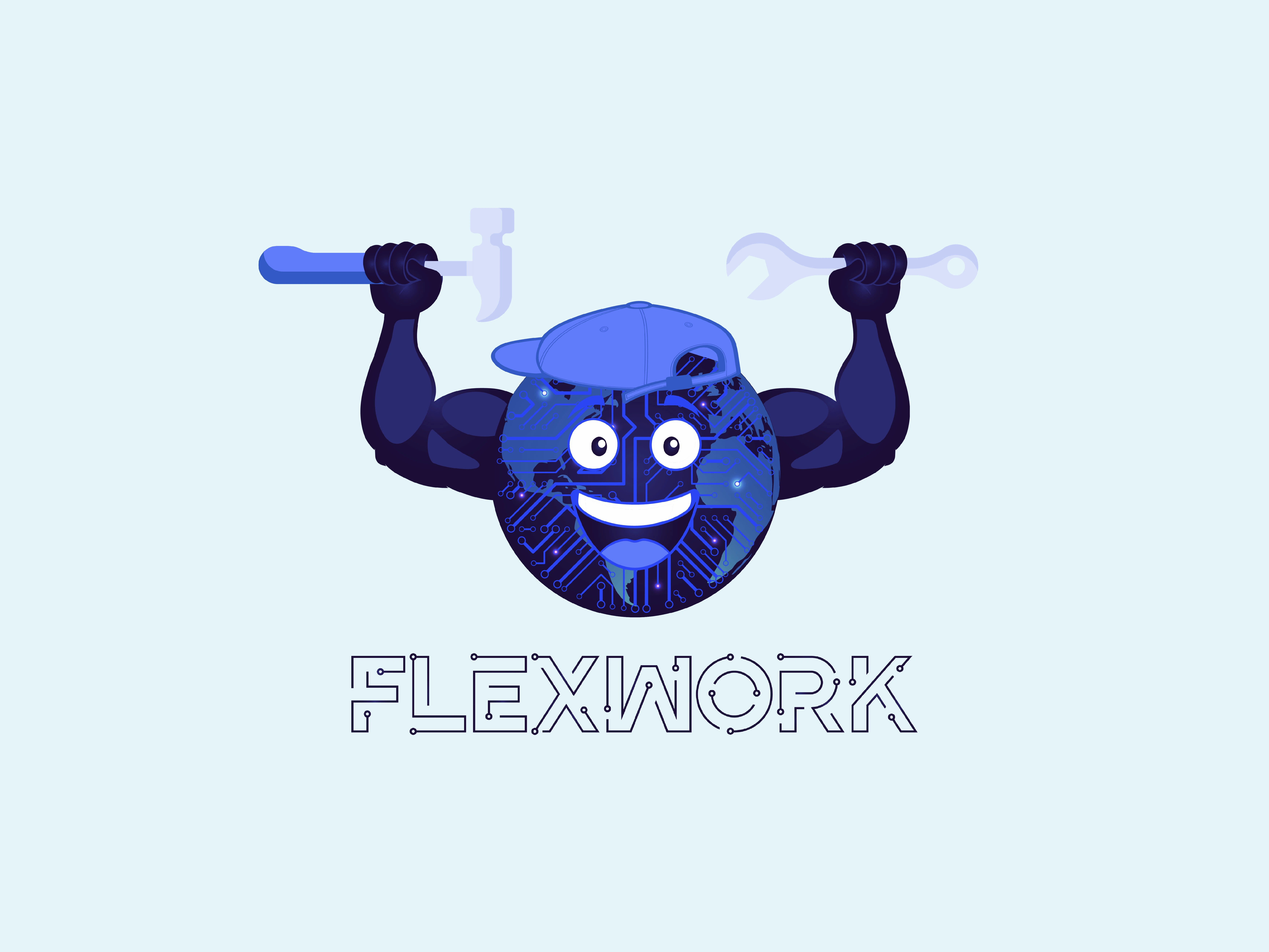 Bold mascot logo for Flex Work, designed to represent reliable, fast and professional repair services with a friendly character-driven brand identity.