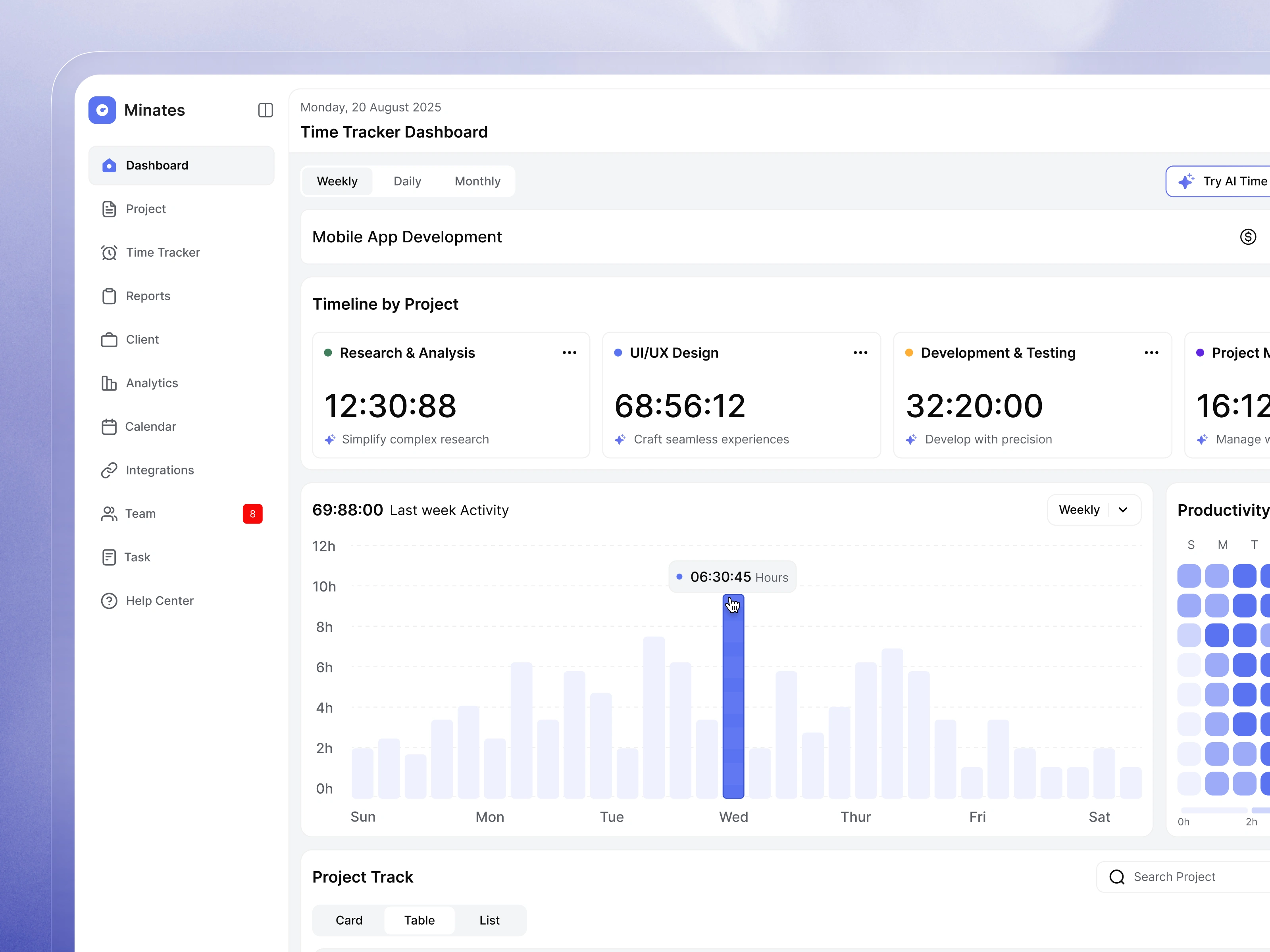 A professional time tracking dashboard for Minates. Features a performance-driven SaaS UI/UX to monitor work hours, project progress, and team efficiency.