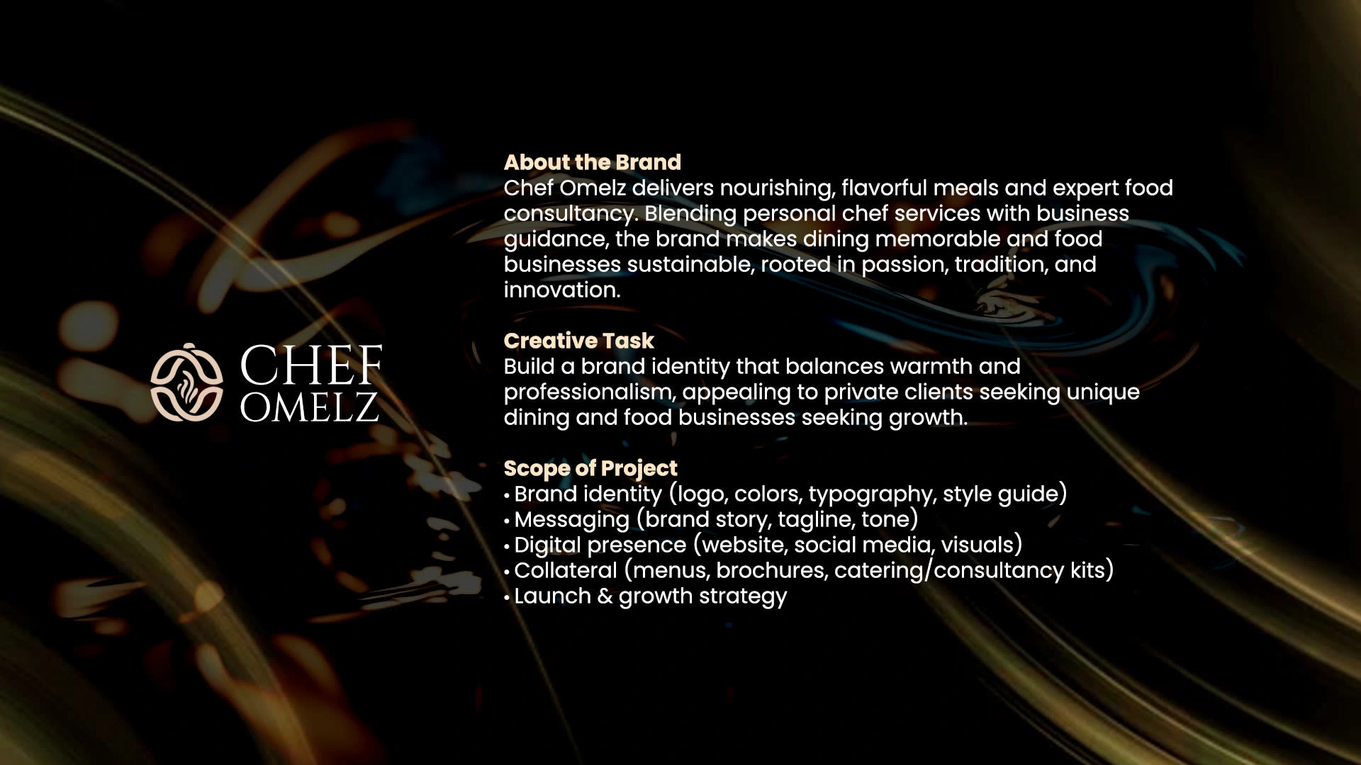 Chef Omelz needed a visual identity that could appeal to both premium clients and food entrepreneurs. The design had to balance culinary artistry with business professionalism, elegant enough for private dining, yet structured for consulting and brand partnerships.