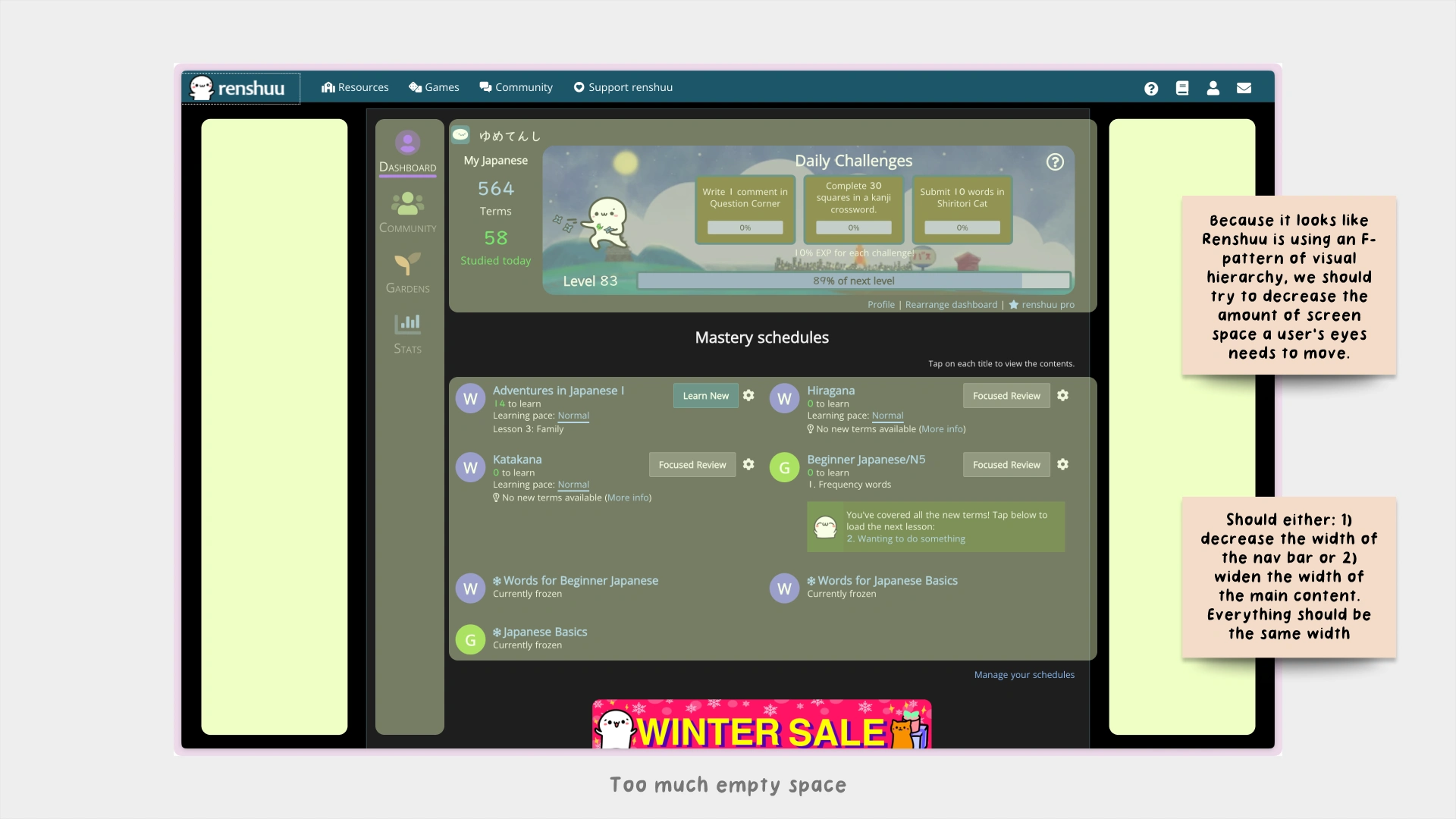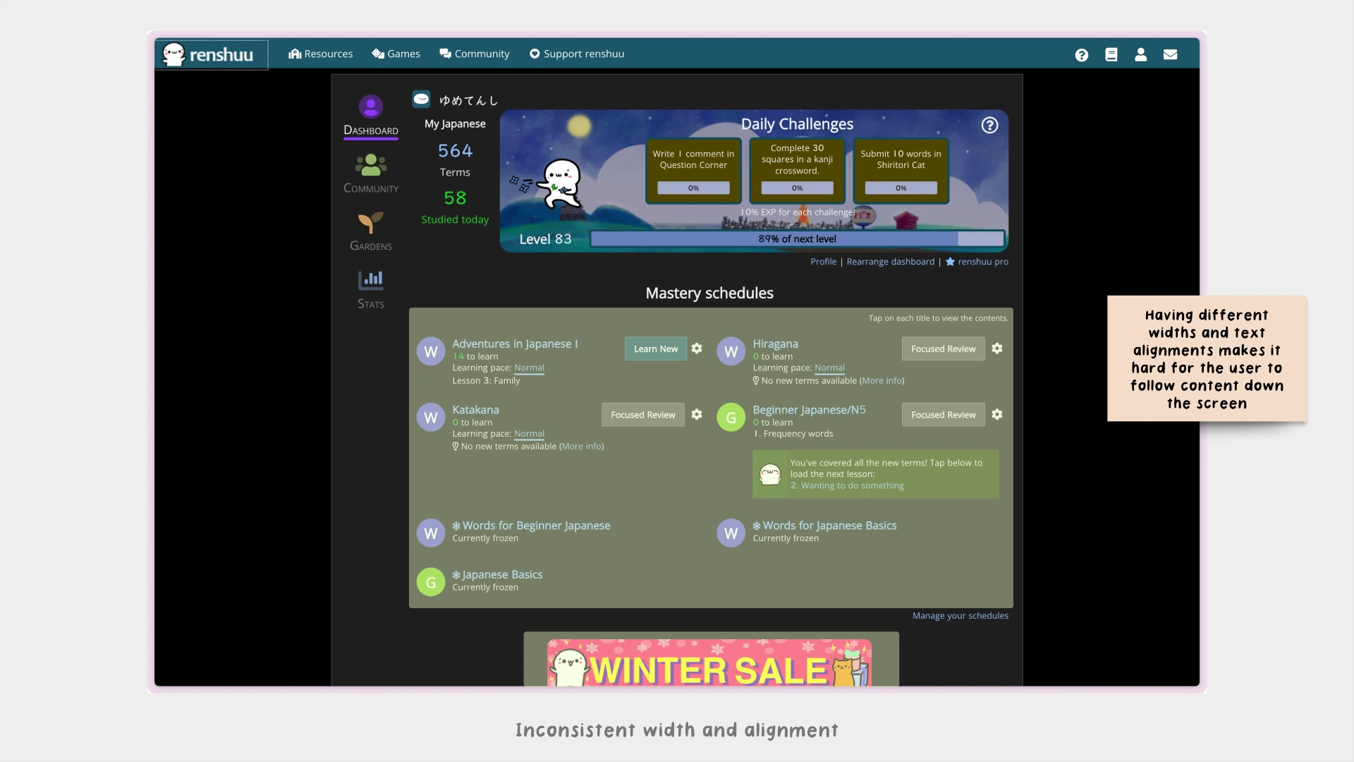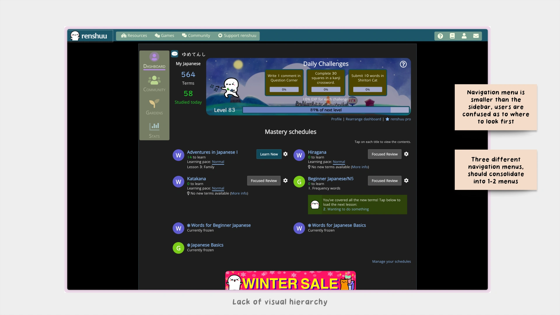 As an online Japanese learning platform, Renshuu stands out as one of the best resources for language learners, offering comprehensive content from grammar to vocabulary and games. However, its extensive feature set has led to organizational challenges, resulting in a cluttered homepage. Renshuu's outdated design identity creates a confusing user experience, making it difficult for users to understand how the site works.