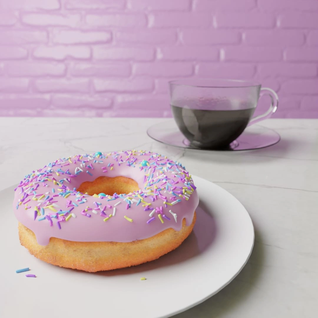 The scene captures the warmth and tranquility of a cozy morning, showcasing intricate details like the donut's glaze, texture, and sprinkles.