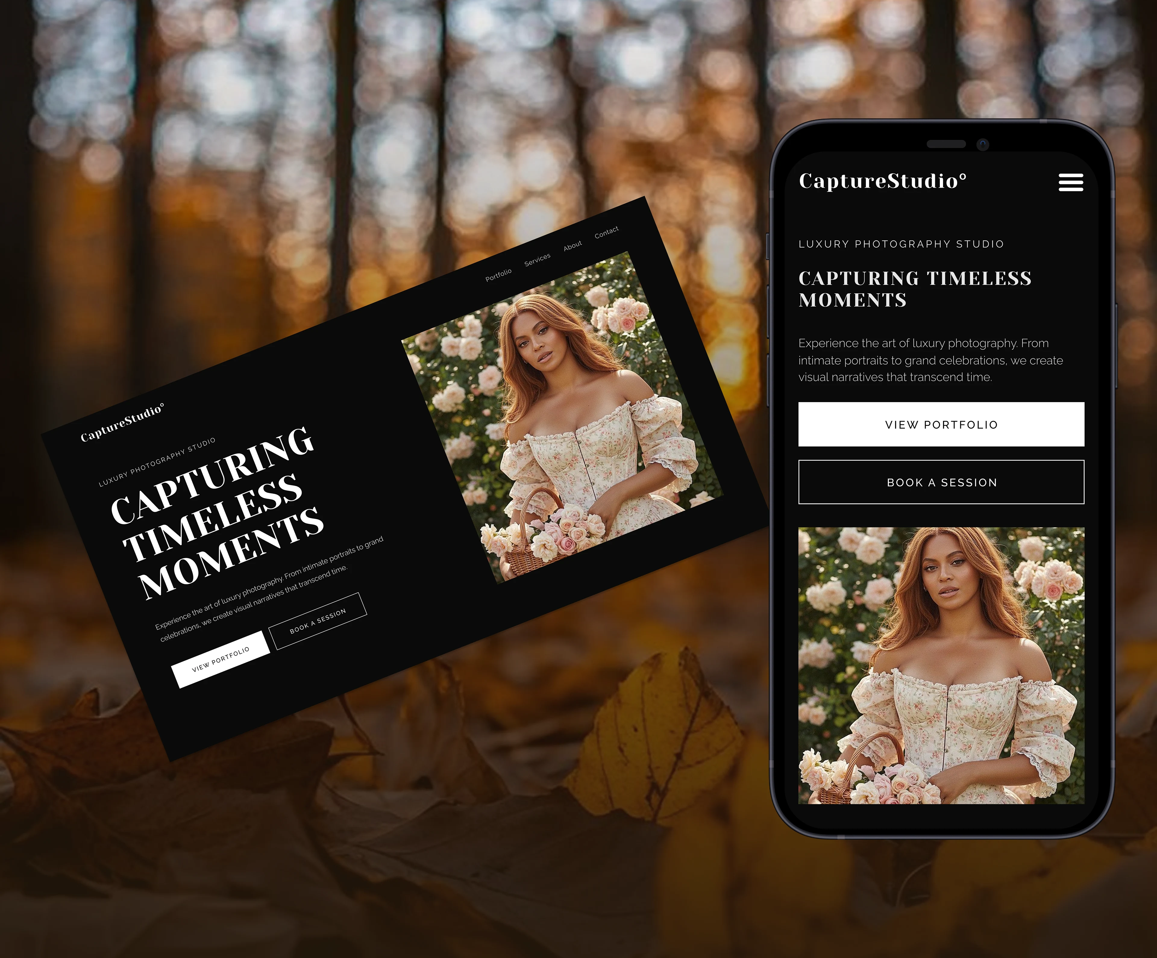 The hero section immediately sets the tone. • Strong headline to communicate the brand promise • Clear call-to-action (View Portfolio / Book a Session) • Calm, confident first impression