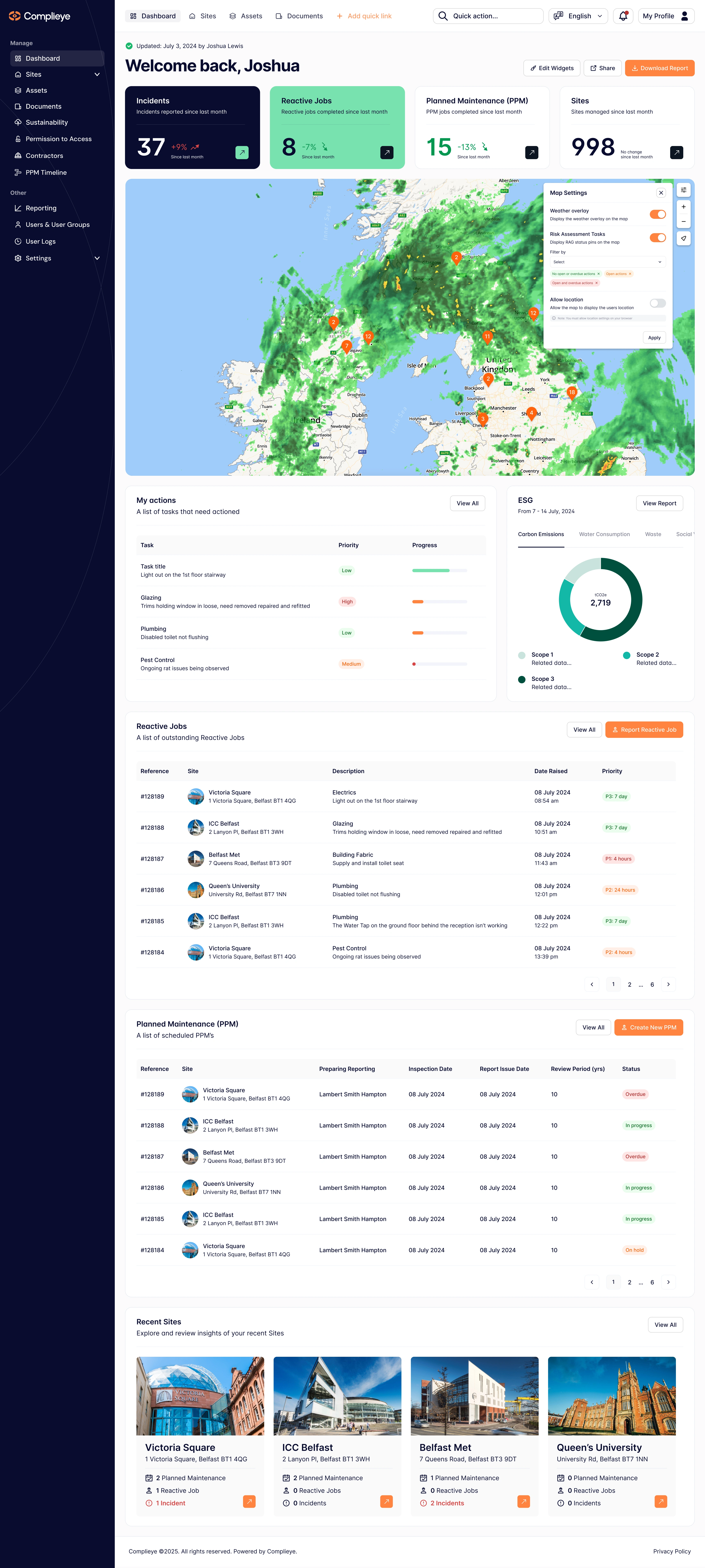 I designed the main dashboard UI for Complieye—a property compliance and maintenance management platform. My approach focused on actionable clarity, geospatial insights, and real-time reporting for multi-site management. The dashboard brings incidents, jobs, and ESG data front and center with interactive maps, task prioritization, and live performance metrics. Every element—from the overview cards to the visual site explorer—was optimized for busy teams to track, act, and report seamlessly. Result: a highly functional, modern interface that turns complex compliance data into simple, decisive actions.