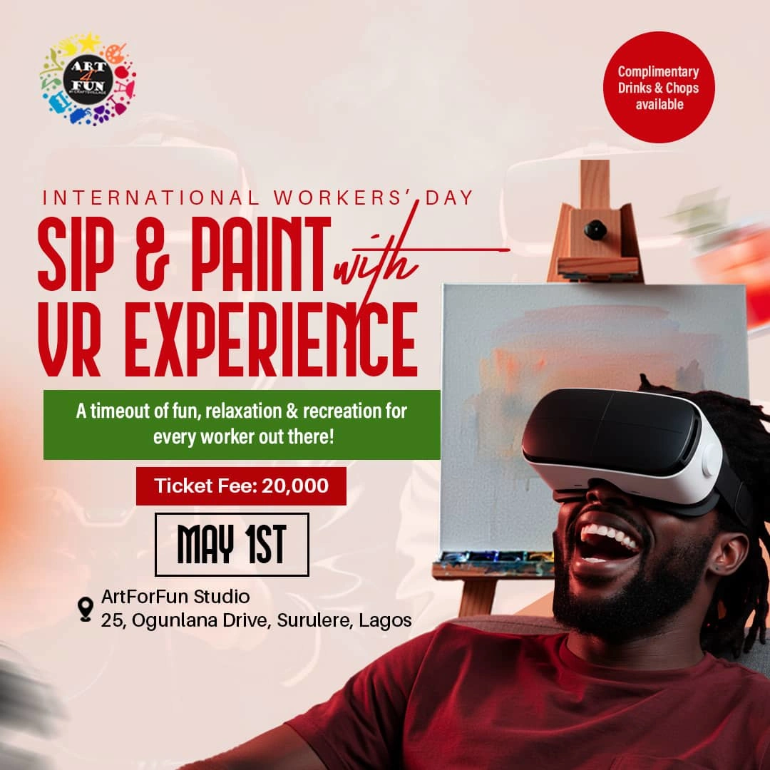 Created an eye-catching social media graphic using Canva to promote Art For Fun's International Workers' Day Sip & Paint with VR Experience.