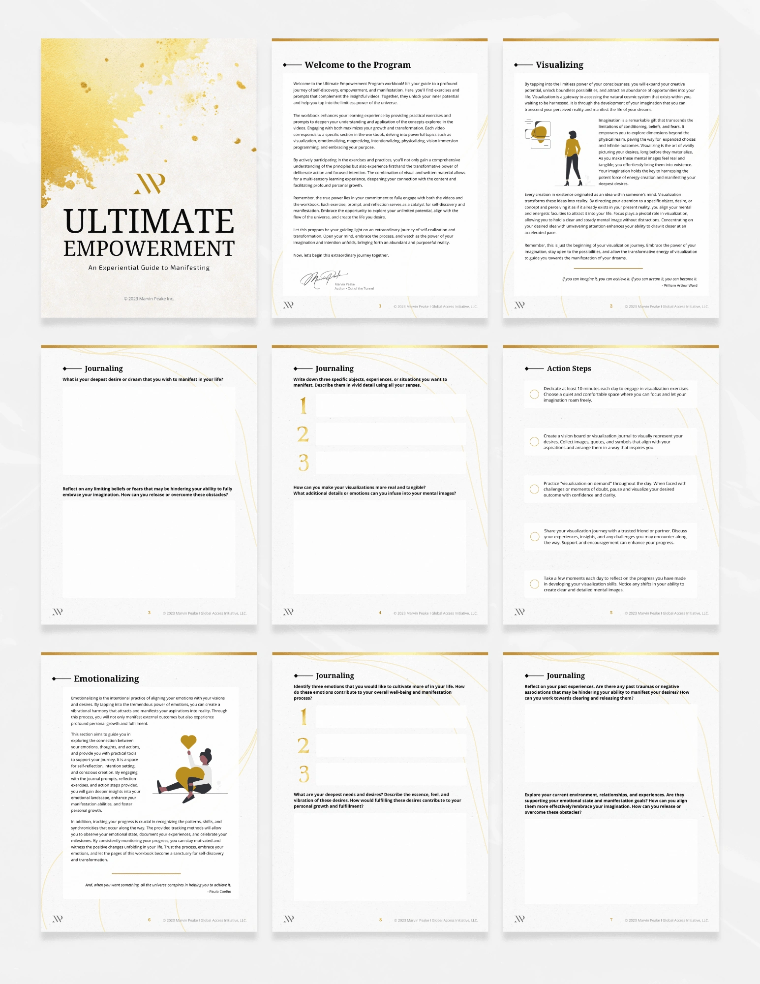 The workbook’s design mirrors the uplifting, almost spiritual tone of the course. I incorporated soft textures, gold accents, and elegant typography to create a sense of warmth and inspiration. Thoughtful use of white space and structured layouts ensures readability, while the flowing graphical elements enhance the workbook’s meditative feel.