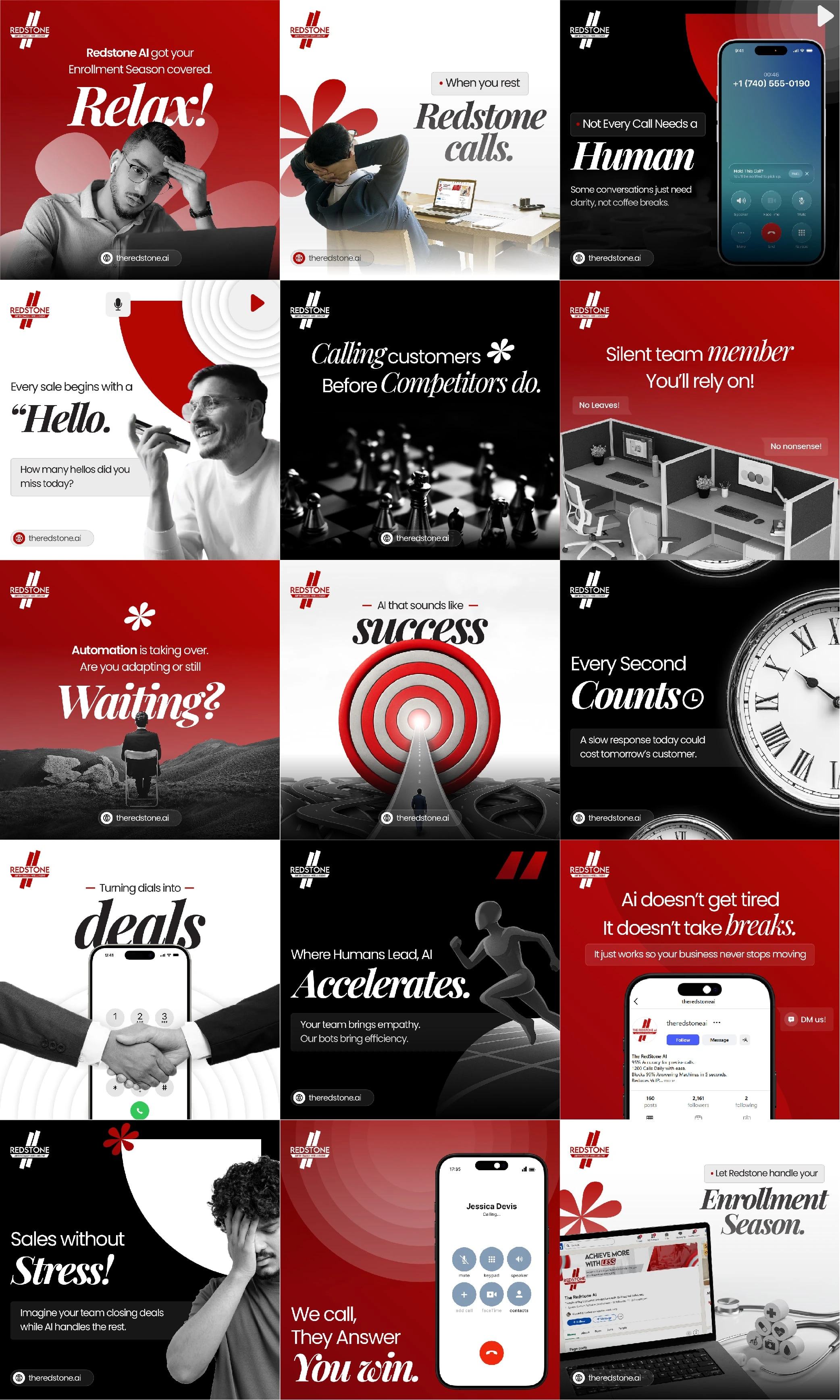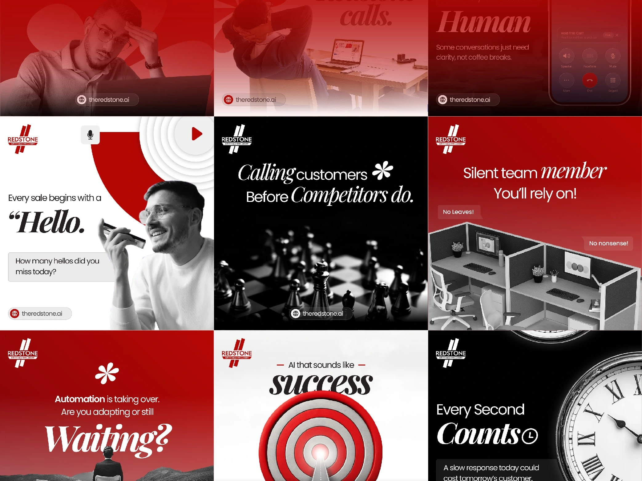I created social media designs and ad visuals for Redstone AI, a company that builds smart bots for customer handling and sales calls. The goal was to make the designs look modern, tech-focused, and easy to understand for people who may not be very familiar with AI. I used a mix of bold typography, simple layouts, and visuals that highlight how their bot helps call centers manage leads and automate communication. Each post was made to clearly explain the product’s purpose while keeping a strong and futuristic brand look.
