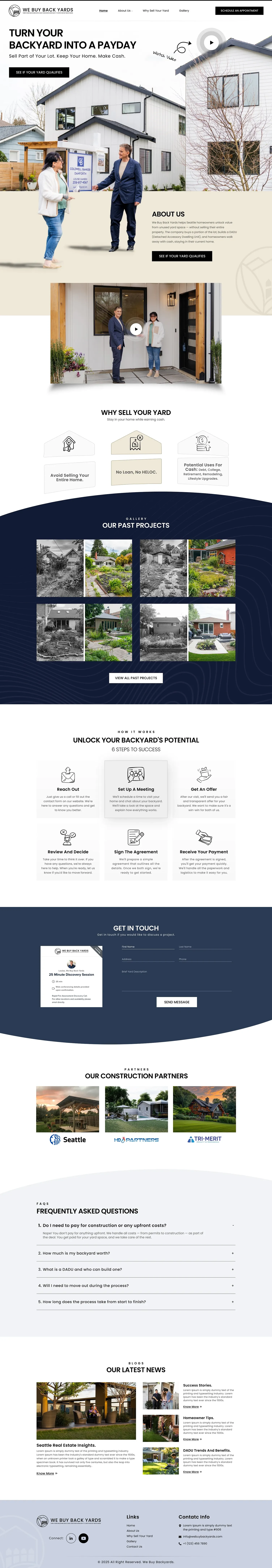 We Buy Back Yards is a real-estate solutions company that helps homeowners unlock hidden value by selling unused backyard space without giving up their entire property. The goal was to design a clean, trustworthy, and conversion-focused website that explains the process clearly and builds confidence through visuals, storytelling, and social proof.