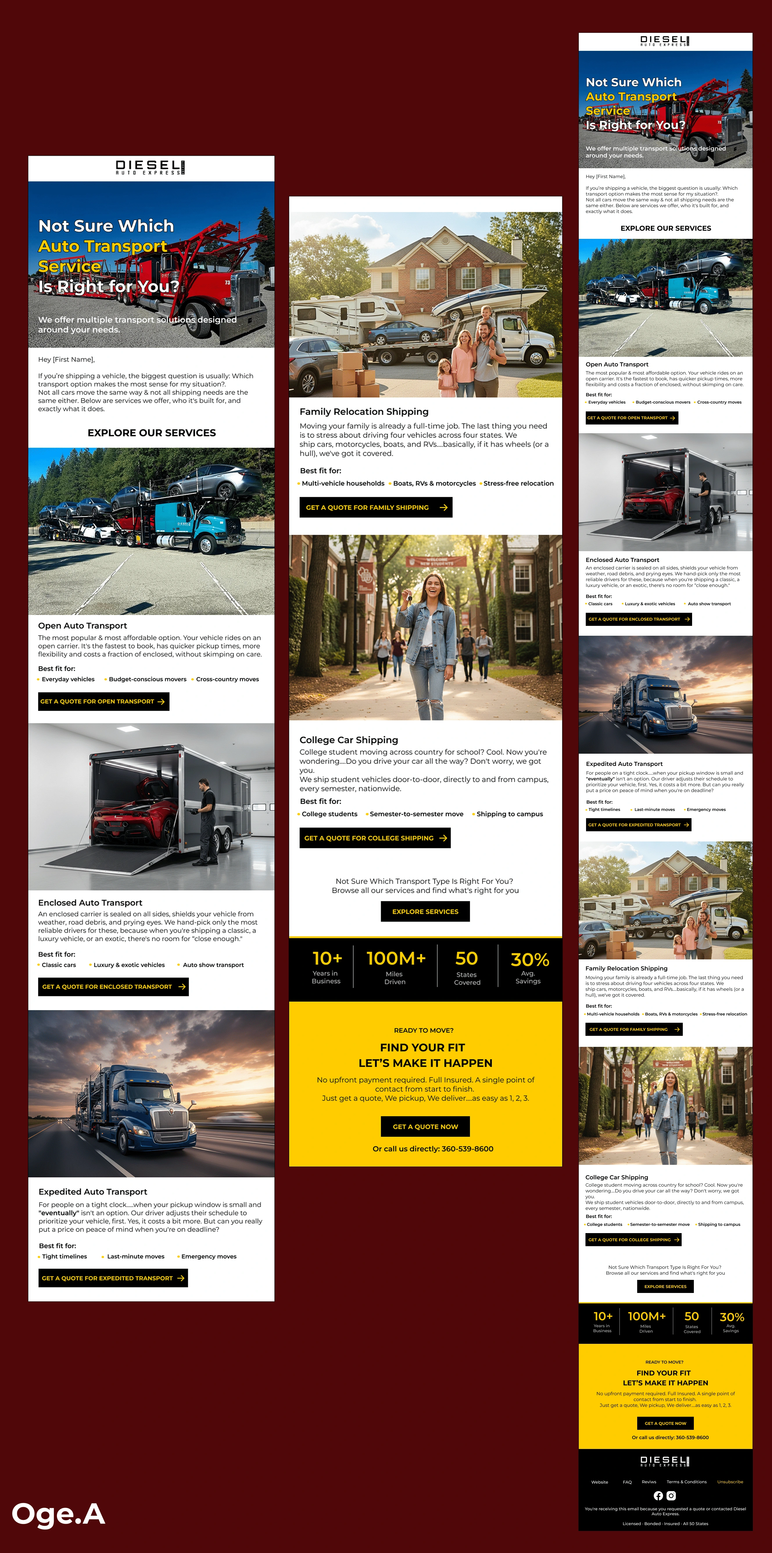 This campaign was built to reduce decision friction. Instead of pushing a single service, the email clearly breaks down each transport option.....Open, Enclosed, Expedited, Family Relocation, and College Car Shipping and explains when each makes sense.