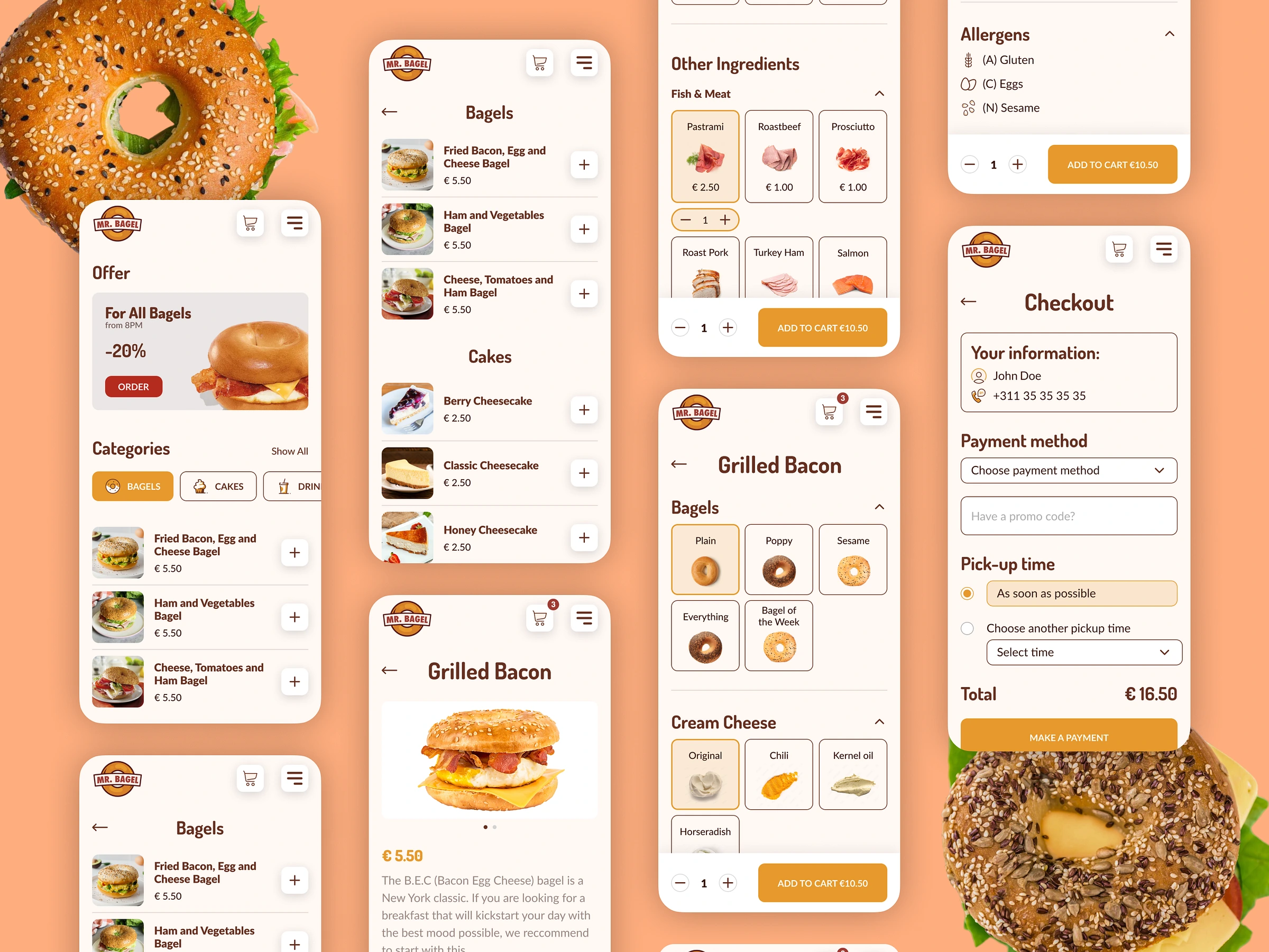The interface of the web platform for a brand of bagels with fillings for every taste. The user goes through a simple registration, selects the ingredients and assembles the perfect bagel on his own. After placing an order, the information is automatically sent to the "kitchen", where the cooks see the orders in real time on their work tablets and start cooking. I developed both interfaces - the client and the internal (for the kitchen) - so that the platform is convenient, fast and understandable for all participants in the process.