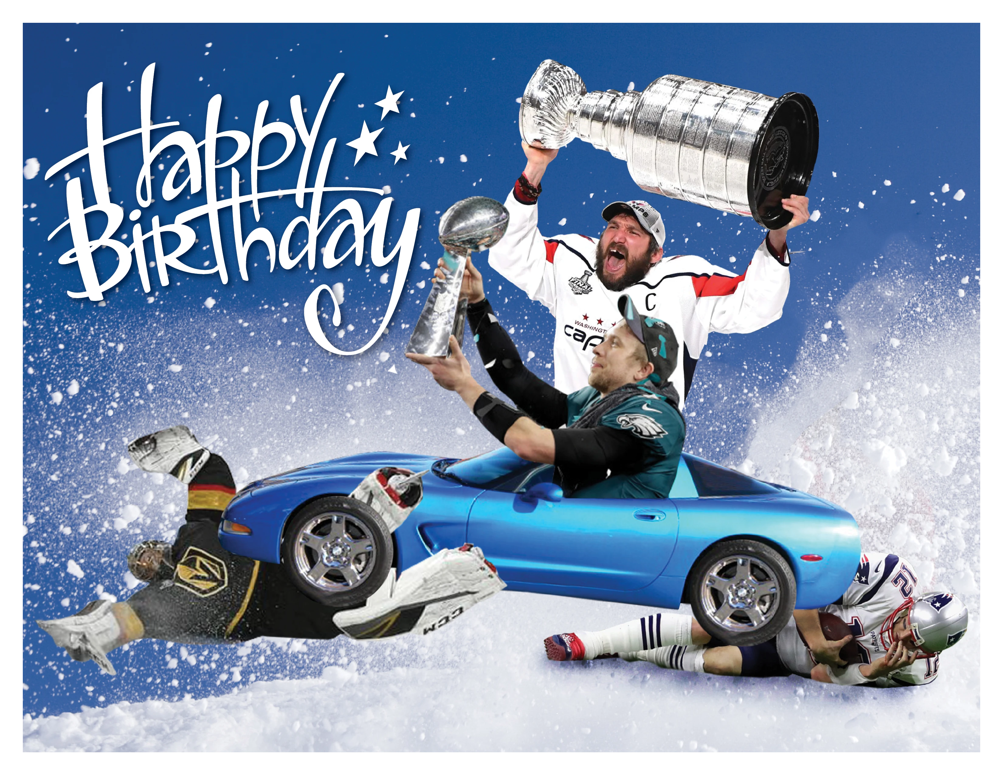 The client requested a light-hearted birthday card cover for a fan celebrating their birthday in the same year that their favorite teams, the Philadelphia Eagles and the Washington Capitals, won the Super Bowl and the Stanley Cup, respectively. They wanted the card to give the fan a chuckle and asked me to incorporate an image of the client’s beloved Corvette into the design. While incorporating the MVPs into the design, I came up with the idea to depict the car driving over the best players from the losing teams, adding a humorous twist.