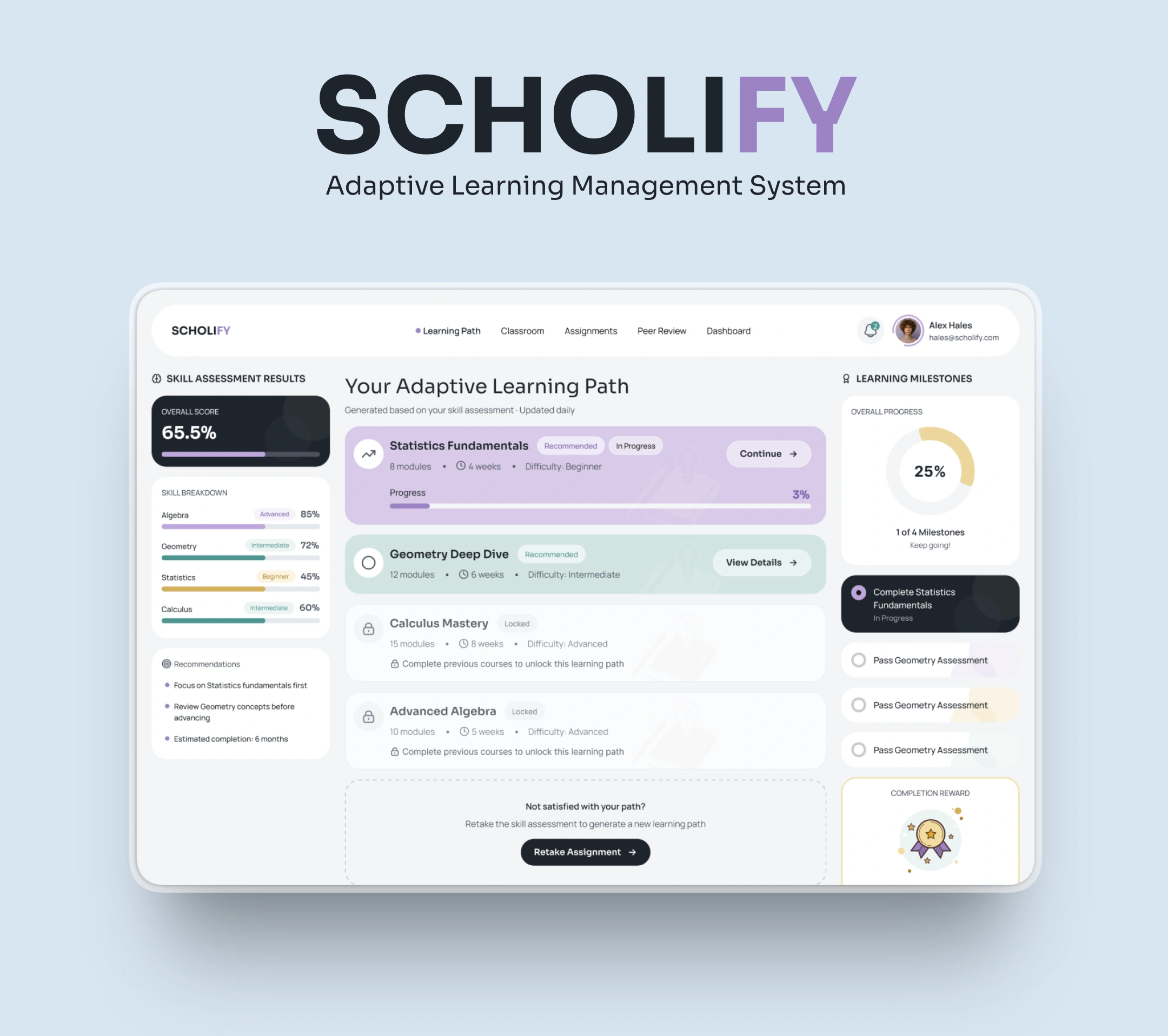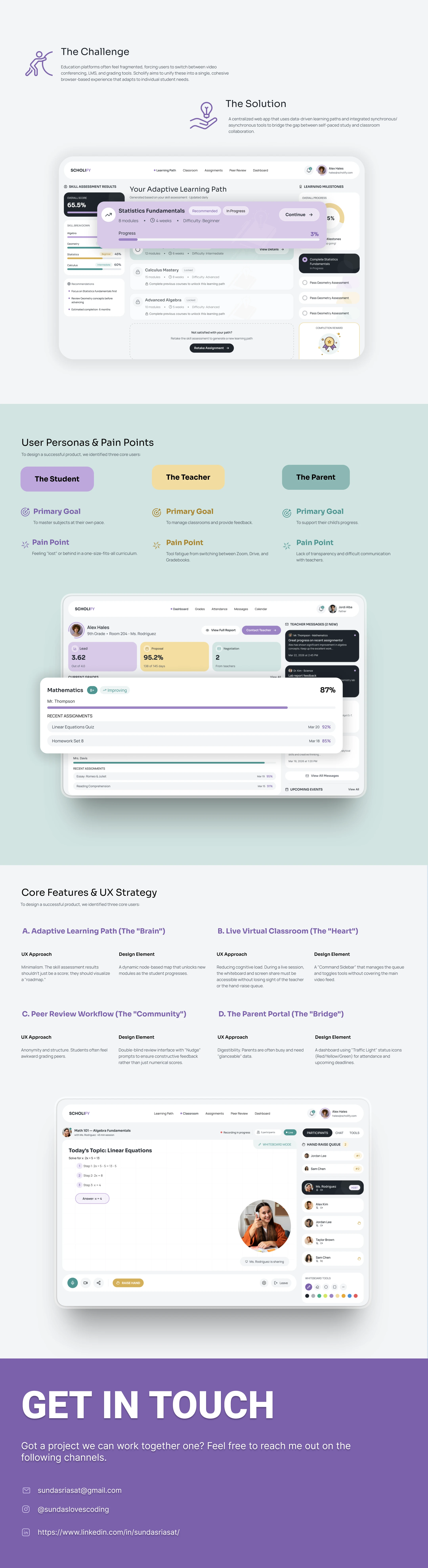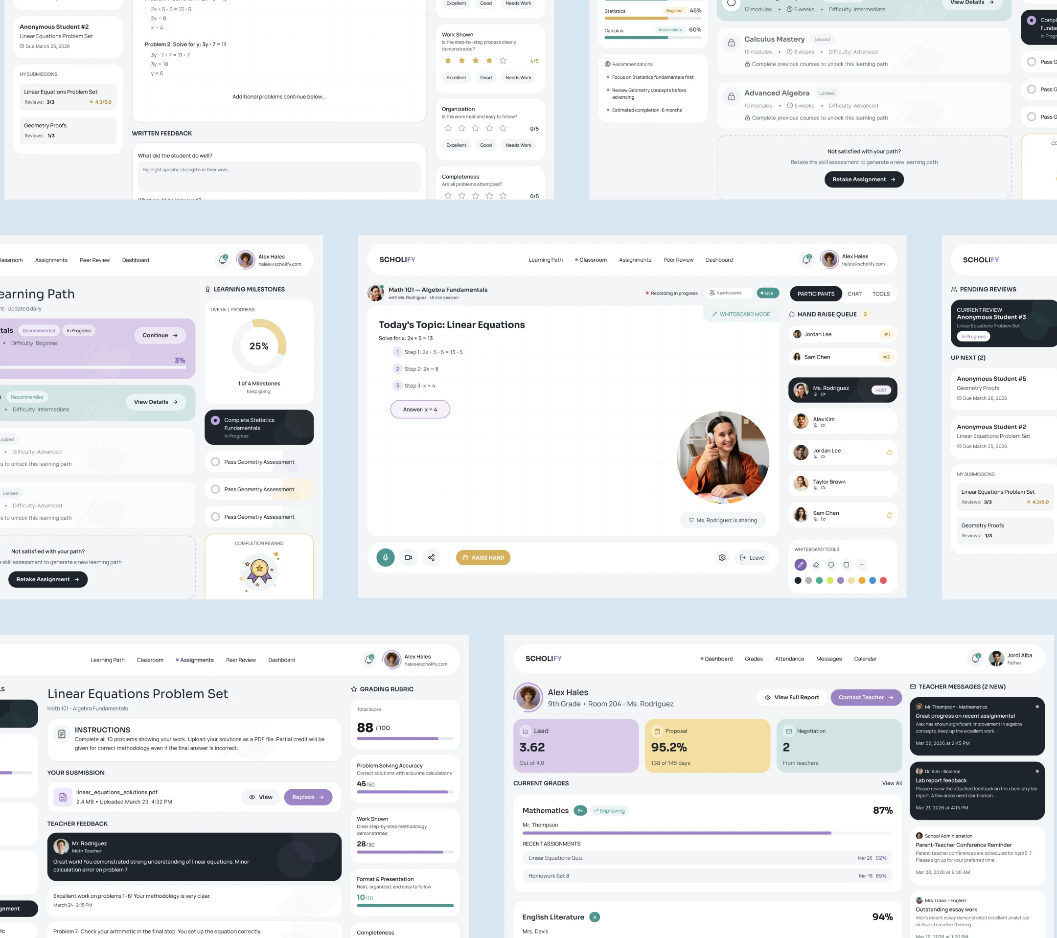 a browser-based web app for an Education company called SCHOLIFY. The features for this app are: - adaptive learning path generator based on skill assessment quiz results - live virtual classroom with screen sharing, whiteboard, and hand-raise queue - assignment submission portal with rubric display, file upload, and grade return - peer review workflow where students evaluate classmates' work with structured forms - parent or guardian portal showing attendance, grades, and teacher message inbox