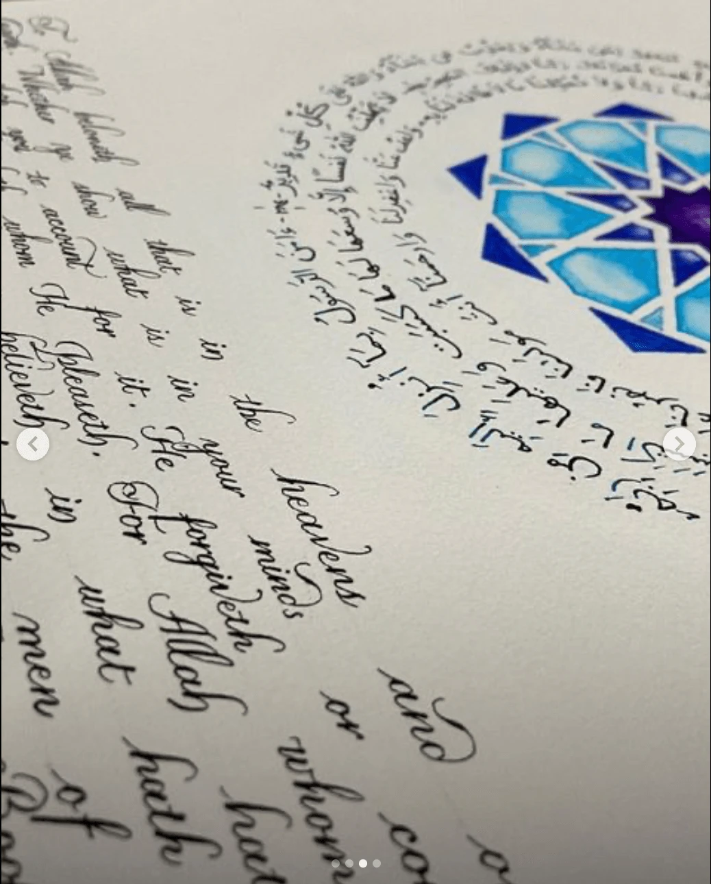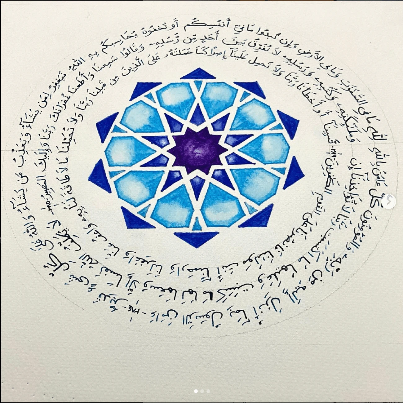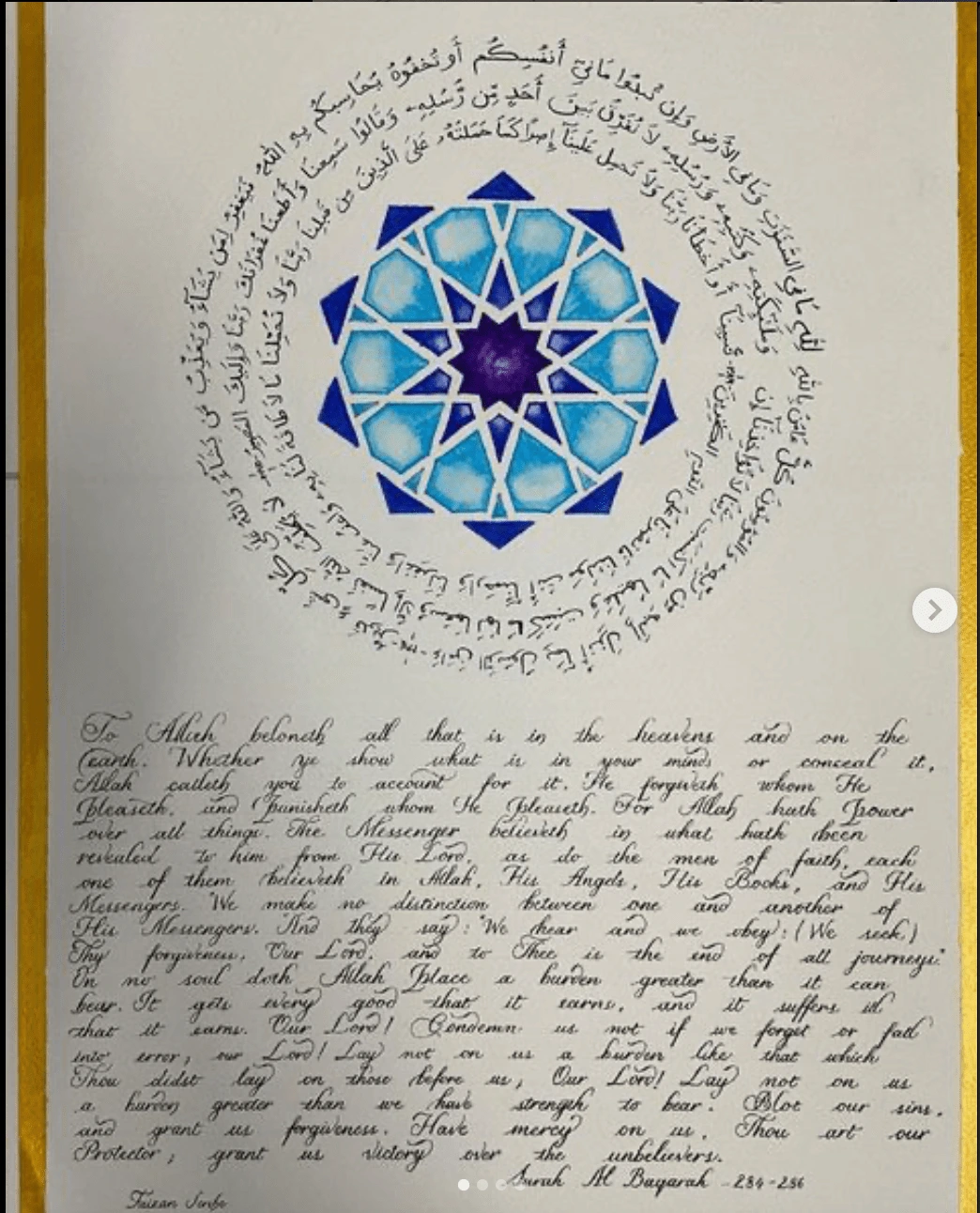 Completely Handmade custom Arabic and English Calligraphy wall art, with intricate geometric design and delicate Copperplate Calligraphy.