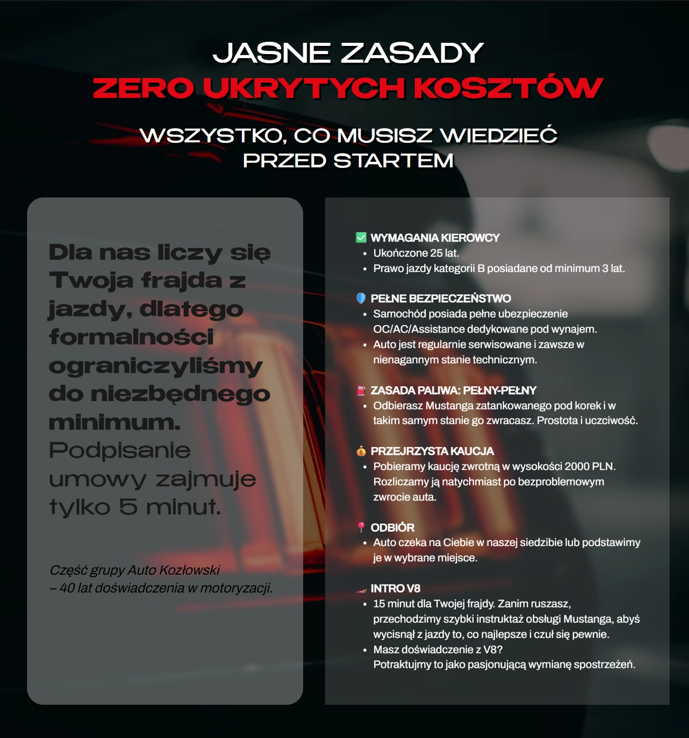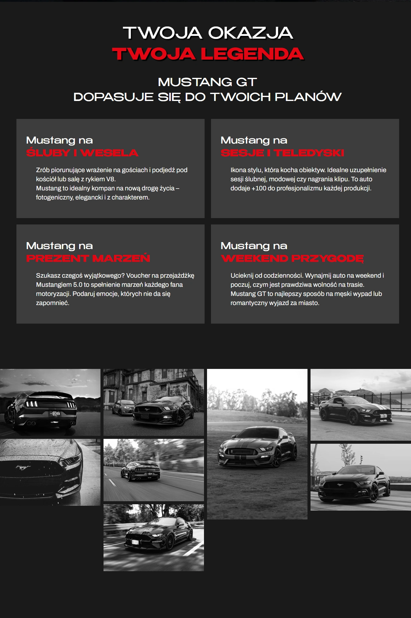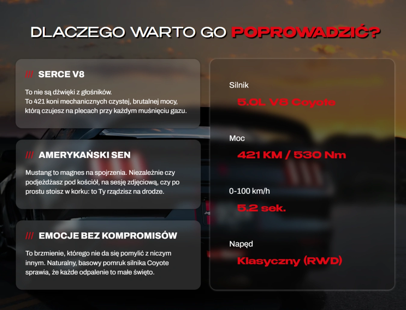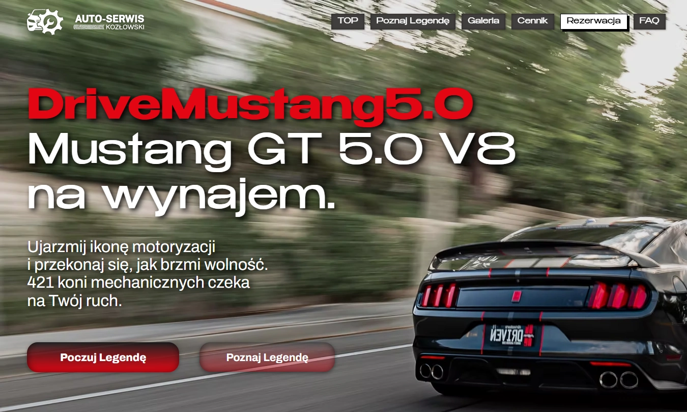 From the initial conceptual phase to final conversion optimisation, the focus remained on capturing the raw character of the American legend – the Ford Mustang 5.0 V8. We utilised a dark, deep colour palette punctuated by bold crimson accents and modern typography (the Benzin font), achieving a high-end aesthetic tailored to automotive enthusiasts and corporate clients alike.