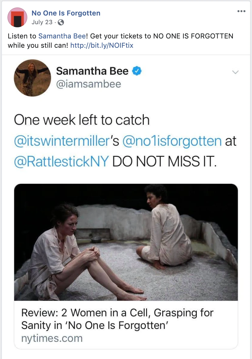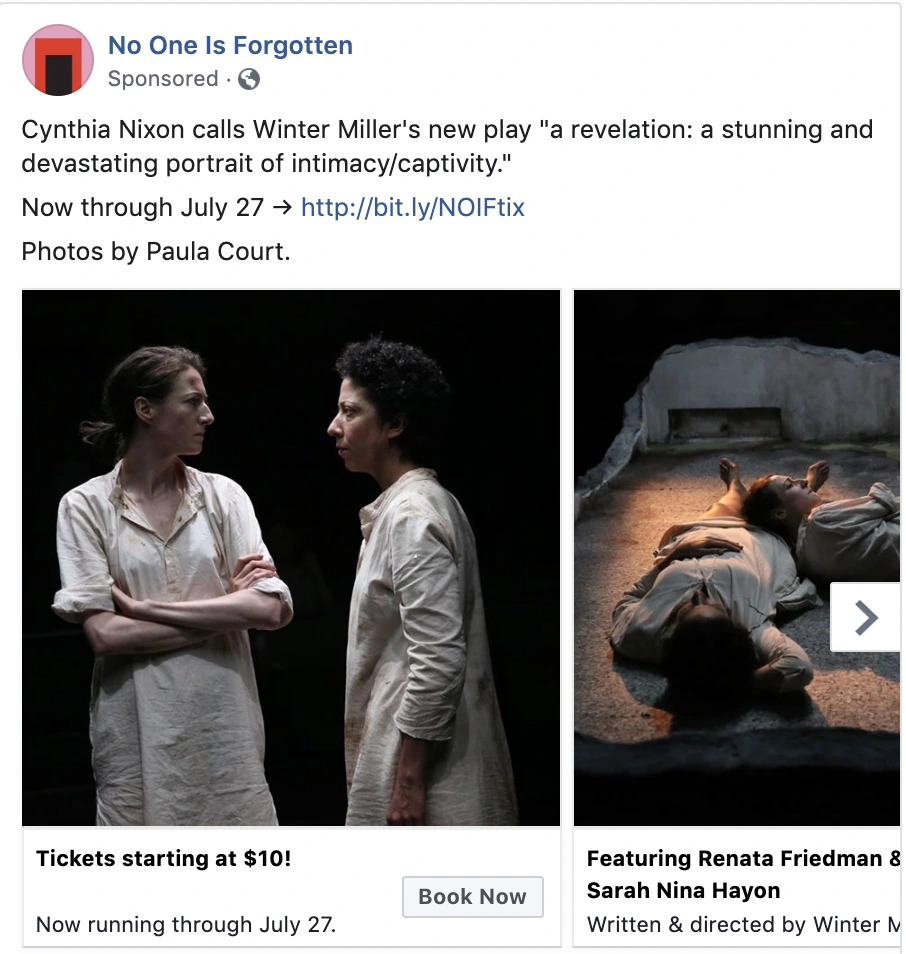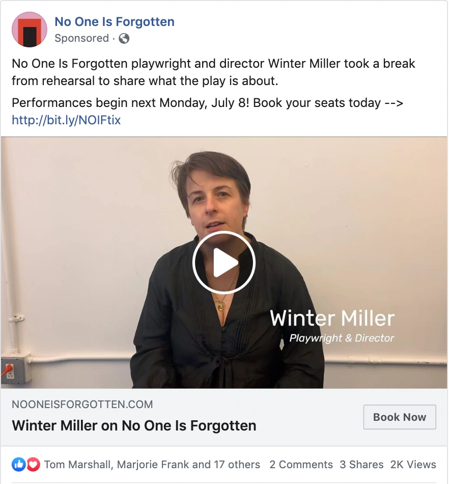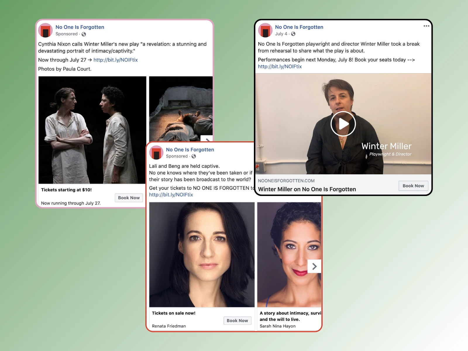 I designed a social media strategy that blended compelling, low-cost content with carefully timed ad placements. On the organic side, I built a content narrative that offered behind-the-scenes looks at rehearsals and creative development, using humor and candid interviews to humanize the process, and soften the sell of challenging subject matter. To expand reach, I coordinated influencer outreach that activated the playwright’s personal network, resulting in shares from prominent supporters like Cynthia Nixon and Samantha Bee. Paid ads on Facebook and Instagram were deployed in three distinct phases—ticket onsale, mid-rehearsal, and show run—each using fresh content like rehearsal photos, press coverage, and reviews to increase urgency. I worked closely with the cast, creative team, interns, press rep, and media crew to maintain message consistency and momentum.