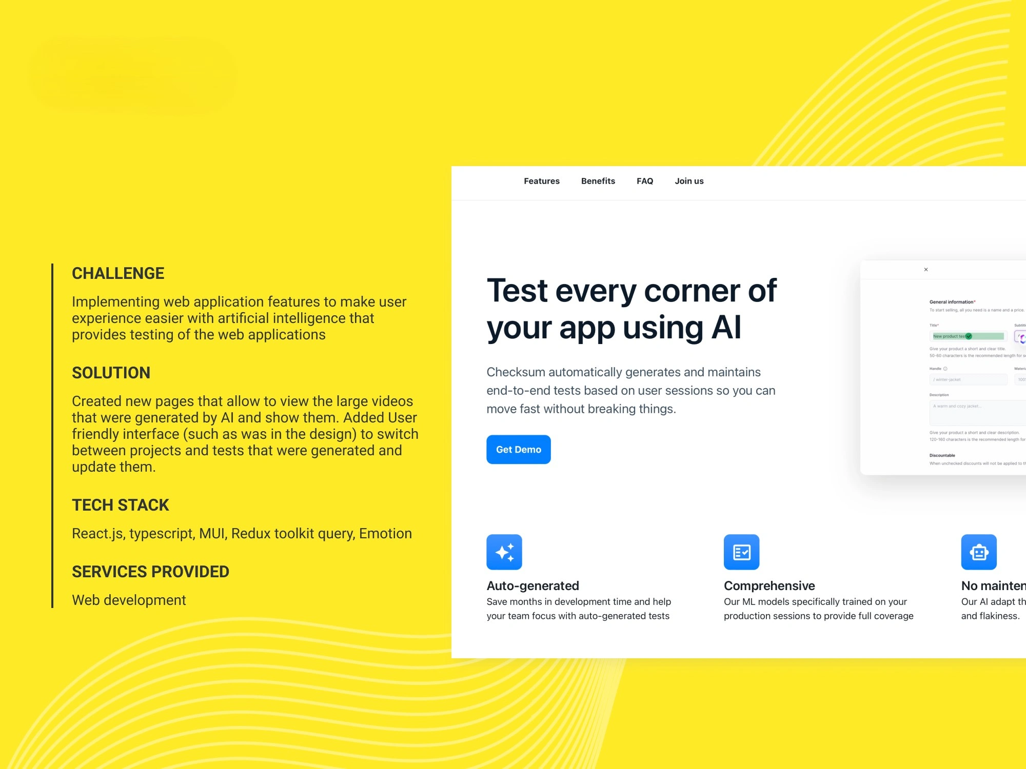 Project Description: I was responsible for developing and integrating AI capabilities into a web application to optimize user experience and enhance QA workflows. The AI module was designed to automate testing scenarios, identify UI and logic issues, and provide real-time improvement suggestions. For the backend, I utilized PHP and Laravel to manage business logic, APIs, and data processing. On the frontend, I built responsive and user-friendly interfaces using React and TypeScript, ensuring seamless performance and usability across a multitude of devices.