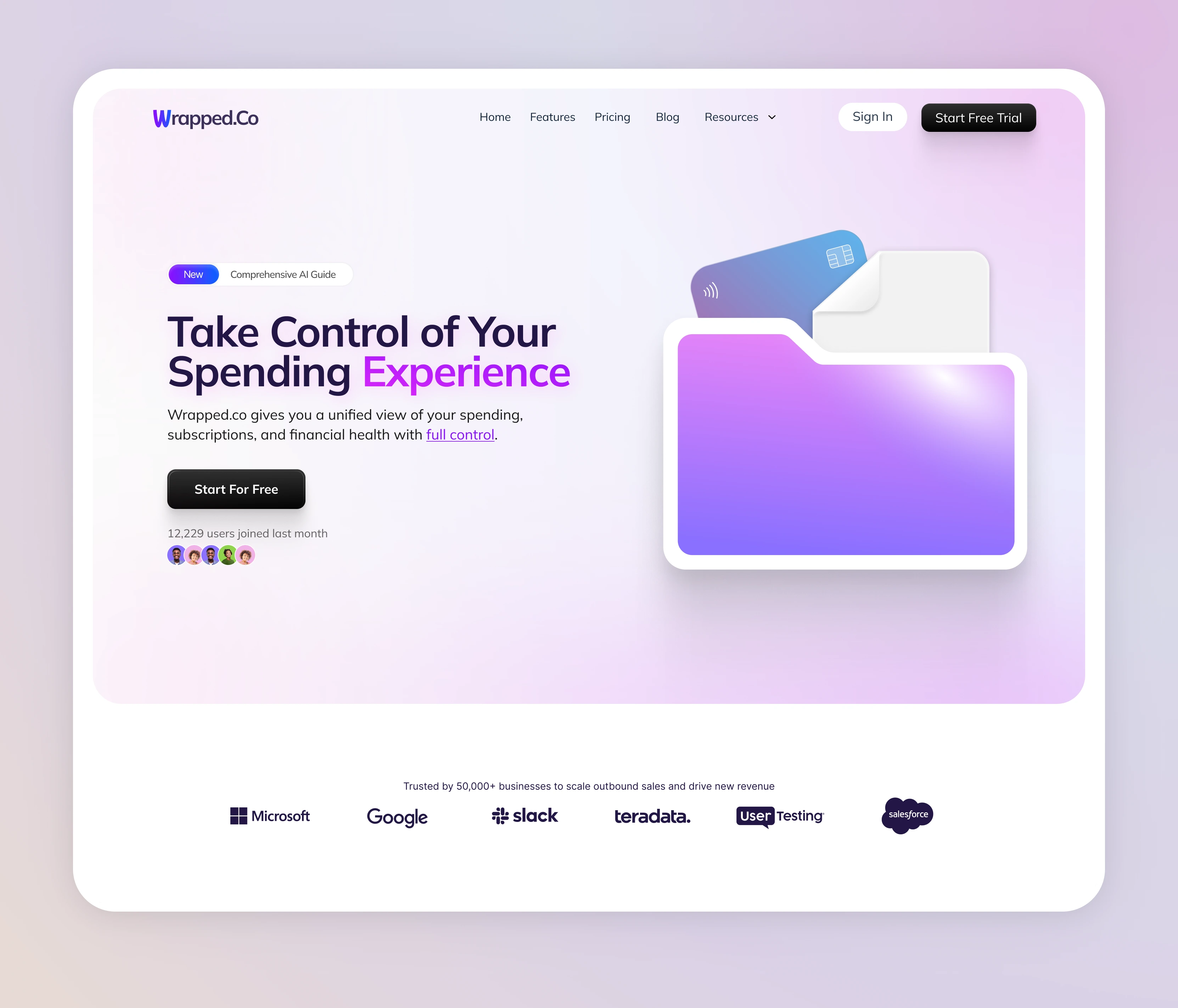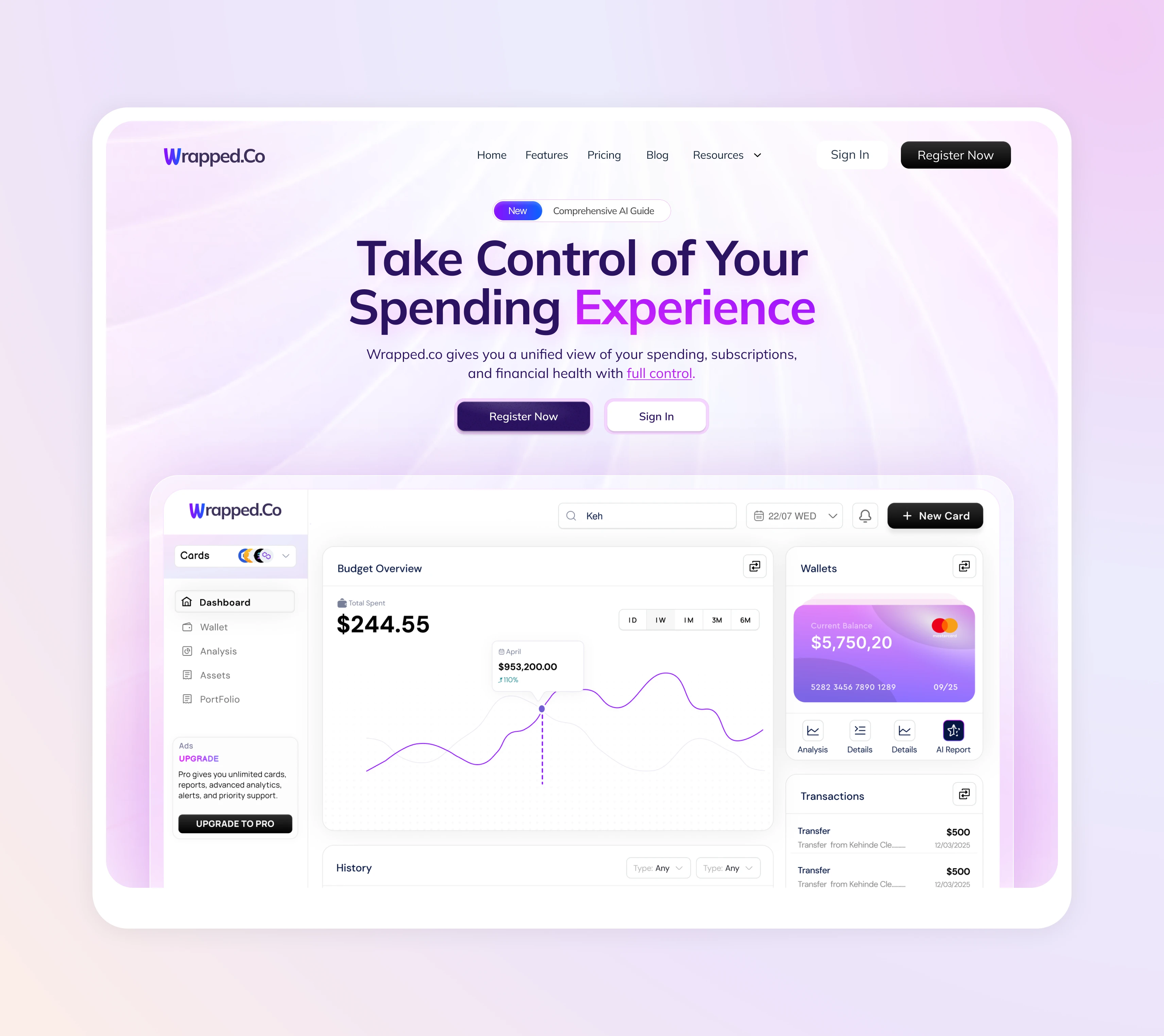Wrapped is a fintech SaaS product that helps users manage their credit card spending, subscriptions, and financial health. The layout is clean, modern, and conversion focused with soft gradients, and a bold typography.