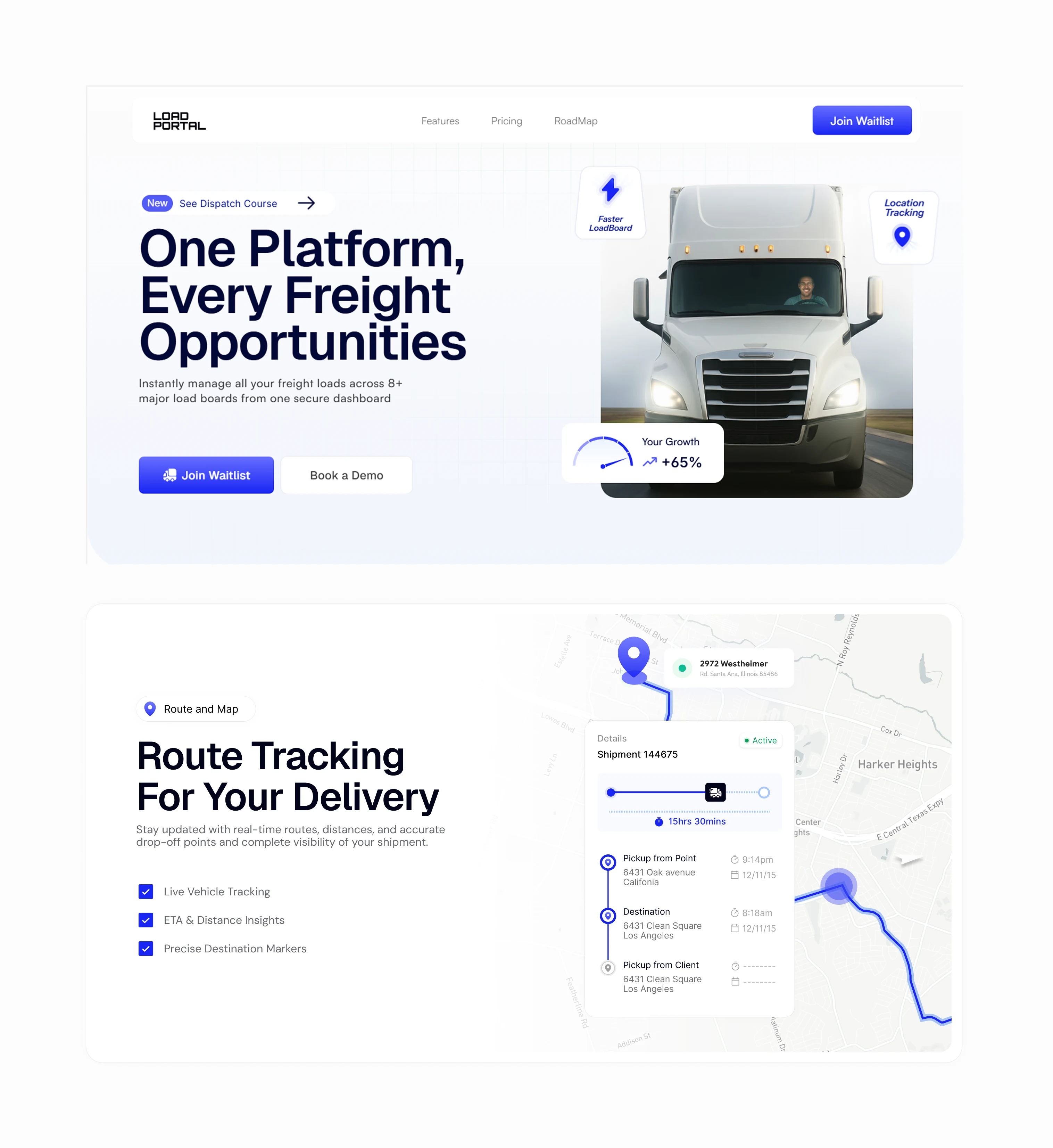 LoadPortal is a modern freight and logistics platform designed to connect shippers and carriers effortlessly. LoadPortal simplifies complex logistics workflows with thoughtful UI/UX design and smooth interactions.
