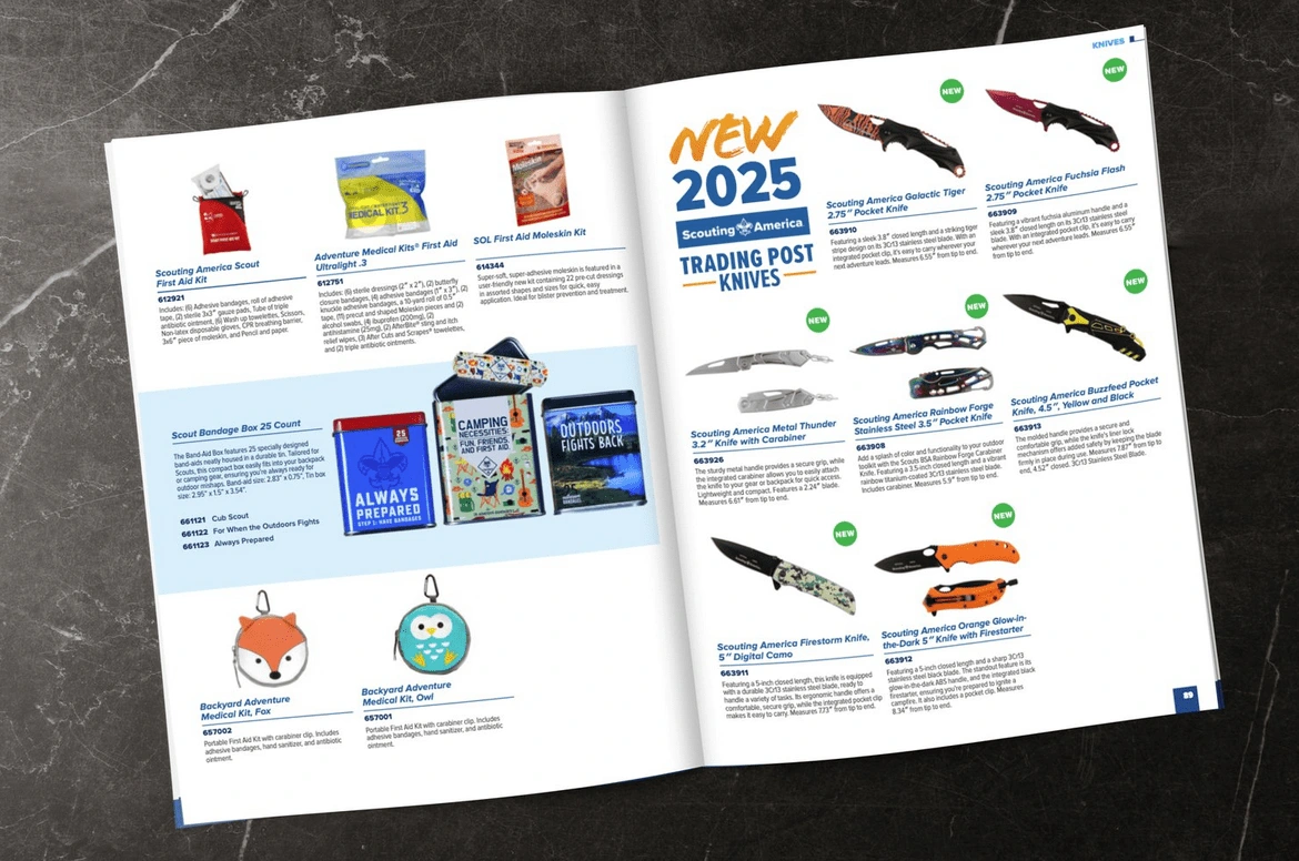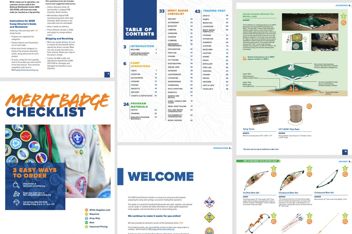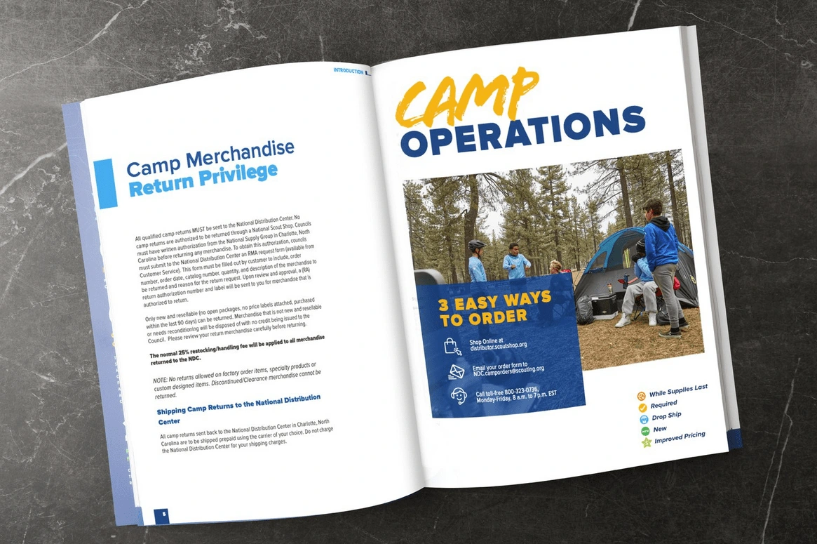 Every year, Scouting America’s Supply Group creates a comprehensive catalog for its wholesale customers, like local councils and independently run Scout Shops across the United States. For the 2025 Edition, I was tasked with updating the list of products and categories showcased, and had the opportunity to update its visuals, refreshing the graphic style and incorporating the new brand. A new digital edition was also created, incorporating interactive elements, like videos and links to special forms or websites that expanded the catalog’s content.