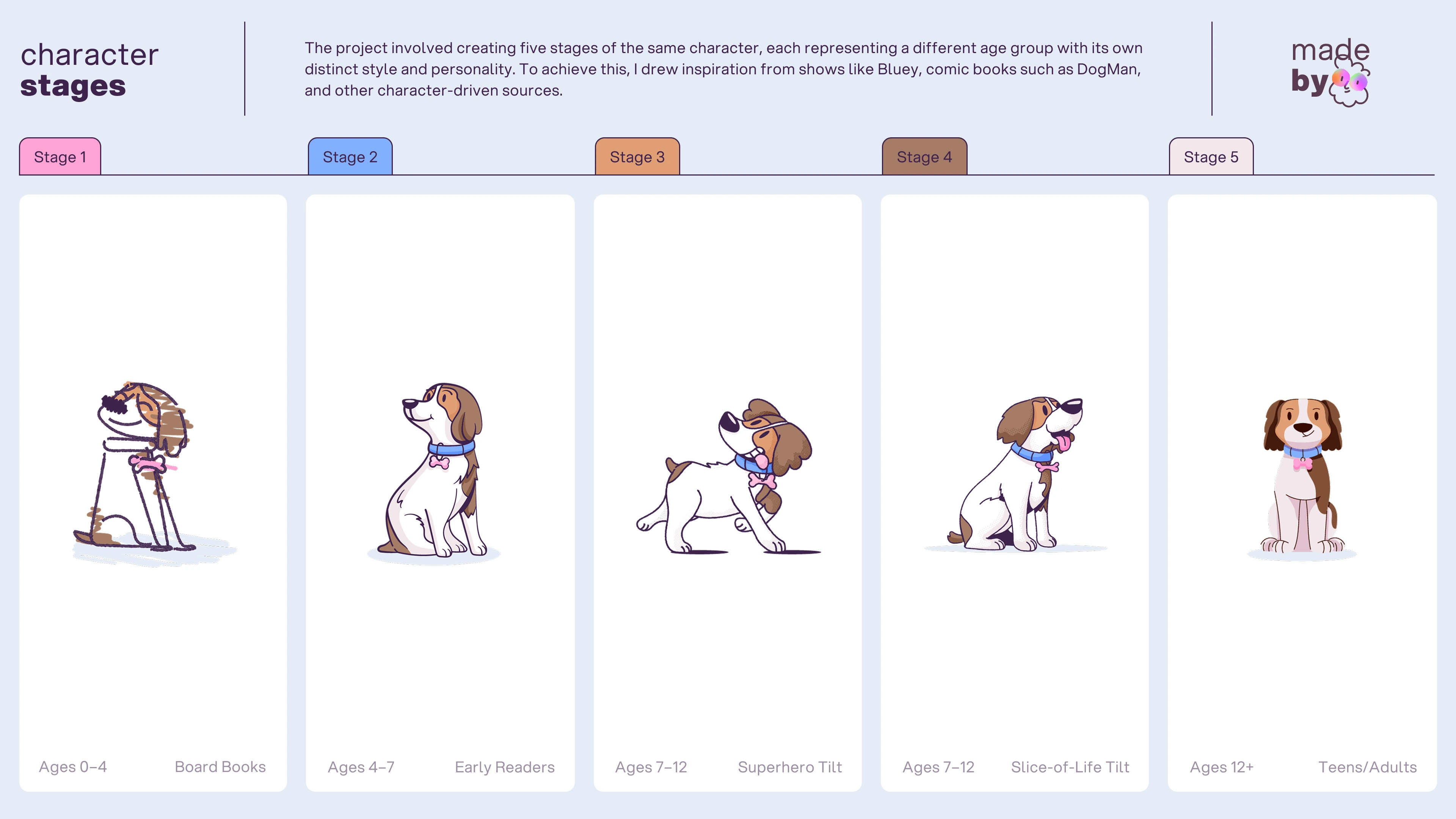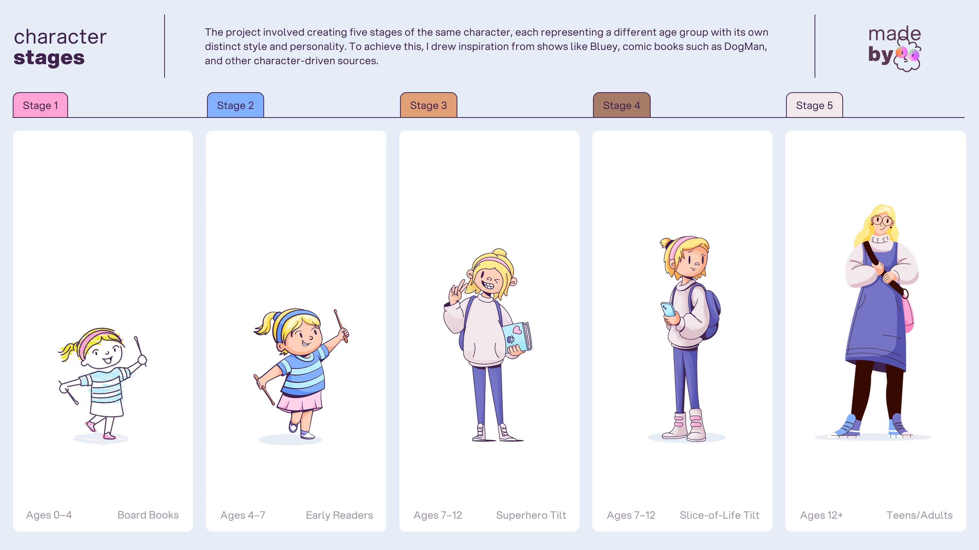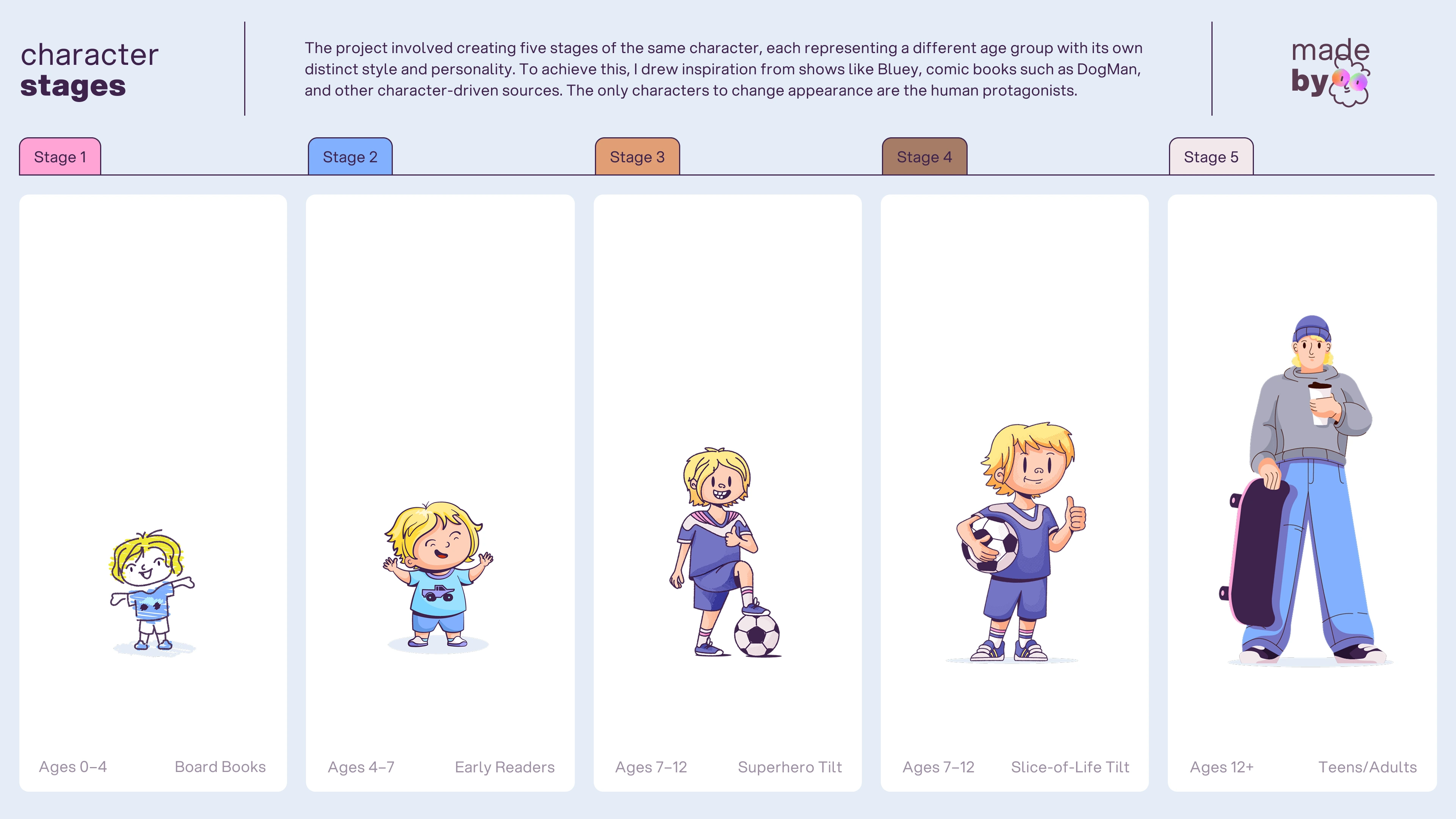 The result is a set of characters that grow, change, and mature visually, yet stay true to their essence. It was a creative exploration of identity, style, and continuity in character design.
